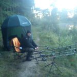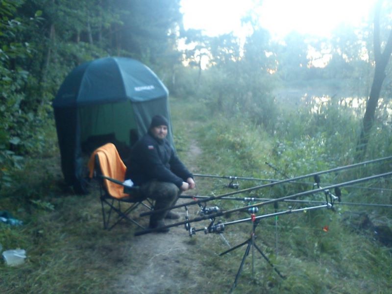 Po tym wszystkim dopiero zabrałem się za rozbijanie parasola i miała miejsce sytuacja z braniem. Po braniu jako że adrenalina pobudziła apetyt mój i Dariusza rozpaliliśmy ognisko i upiekliśmy aromatyczne kiełbaski, pogawędziliśmy popijając złocisty nisko alkoholowy trunek. Około północy udaliśmy się do namiotu celem zmrużenia oka.Wymościłem więc swój fotel Elektrostatyk F5R i zapadłem w sen. Ze snu wyrwał mnie dźwięk centralki i odruchowo na śpiocha wyholowałem ładnego karpika którego oczywiście podebrał równie mocno zaspany kolega. Karpia umieściłem w siatce aby doczekał porannej sesji fotograficznej. Po sesji karpie wróciły do łowiska. Resztę nocy przespaliśmy nie niepokojeni niczym i następnego dnia w okolicy południa zwinęliśmy się i wróciliśmy do domu.