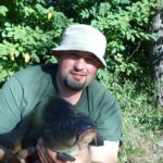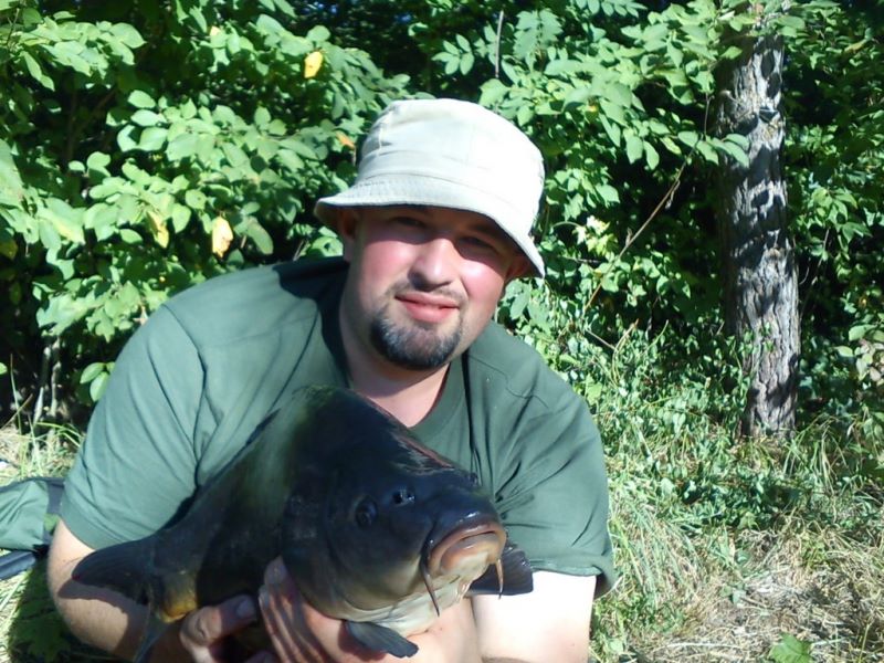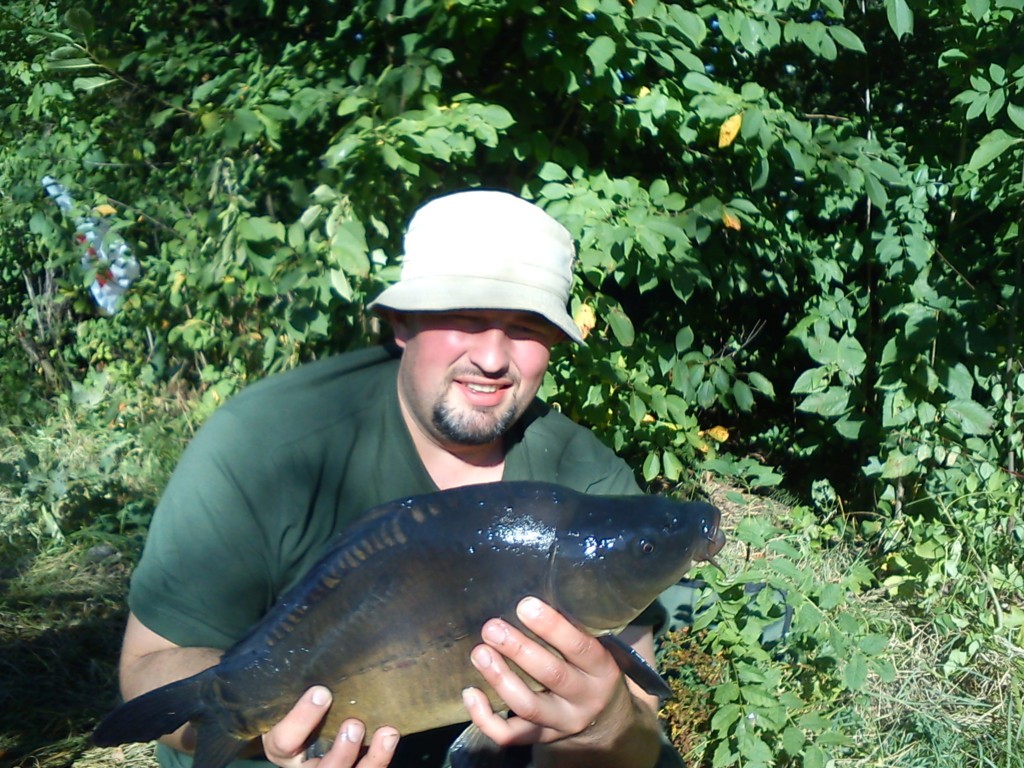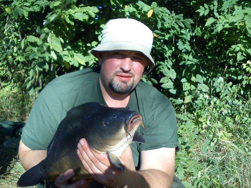 Więc siódmego września umówiłem się z Darkiem na nockę we wiadomym nam miejscu na pobliskich gliniakach. Spotkaliśmy się dość wcześnie aby rozbić obozowisko i za dnia wyznaczyć odległość i kierunek łowienia. Plany te jednak popsuły zorganizowane na zbiorniku zawody wędkarskie.Trzeba było czekać do godziny 20 aż towarzystwo nasyci się kiełbaskami i rozejdzie się do domów. Jako namiot miał nam posłużyć parasol wędkarski marki Konger który jest podgumowany i zamykany do dookoła tak że ani deszcz ani wiatr nie były nam straszne. Parasol rozłożyłem już po zarzuceniu zestawów i nie zauważyłem przyciętego pniaczka o średnicy 15 cm który w wysokiej trawie umknął mojej uwadze, a znalazł się centralnie na drodze wylotowej z namiotu, jako potencjalny potykacz. Postanowiłem pieniek zniwelować przy pomocy siekiery do poziomu gruntu, radośnie rąbiąc pieniek nie martwiłem się przepłoszeniem ryb ponieważ przyzwyczajone są one do takich dźwięków. W czasie gdy już prawie kończyłem rąbanie nastąpiło branie karpia na wędce Darka, który z opanowaniem przyciął i rozpoczął holowanie ryby do brzegu. Po kilku chwilkach walki podebrałem Darkowi karpika którego długość wahała się w przedziale 50-60 cm nie mierząc go Darek włożył delikwenta do siaty w celu doczekania rana i lepszego światła, bo aparat oczywiście wzięliśmy ale w komórce więc chcąc zachować karpia na zdjęciu zmuszeni byliśmy przechować go do rana.