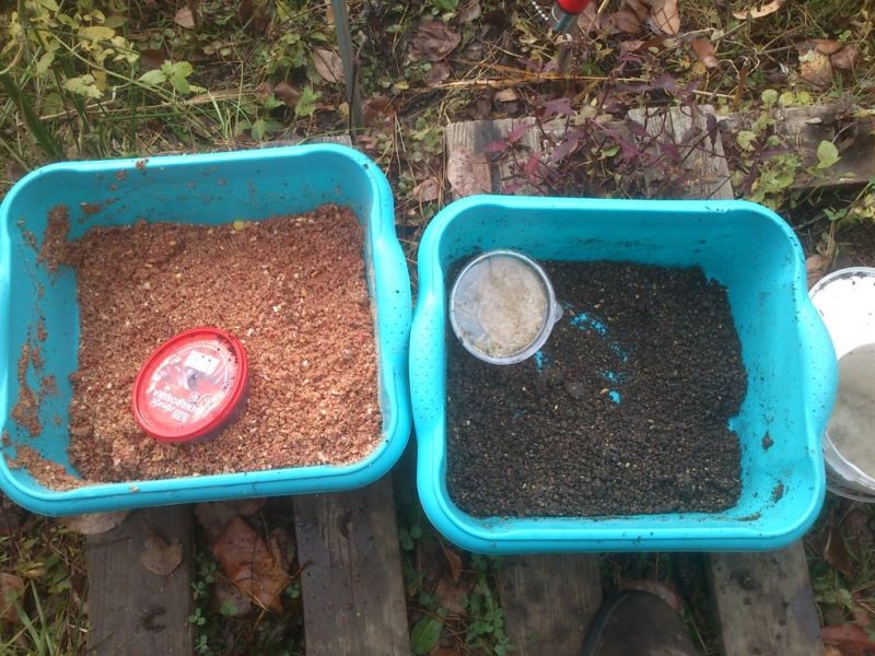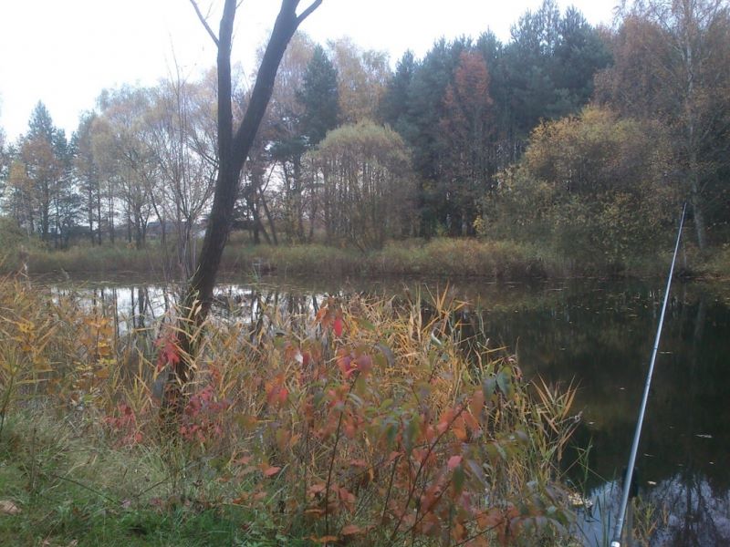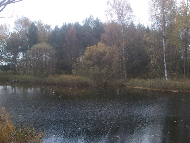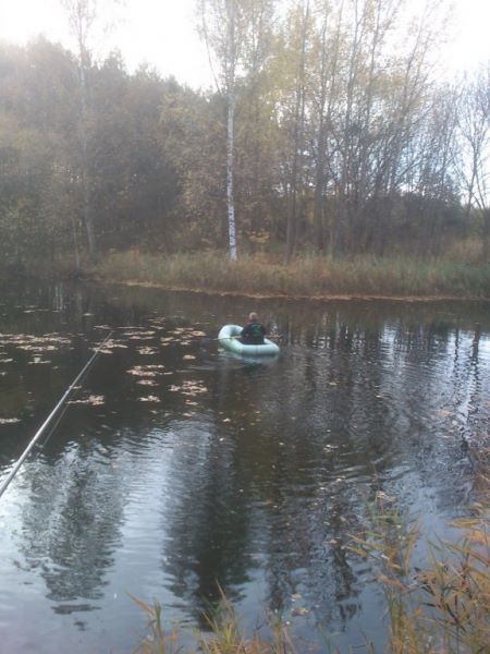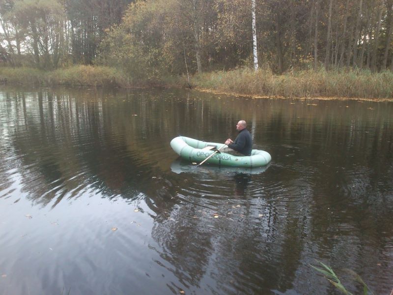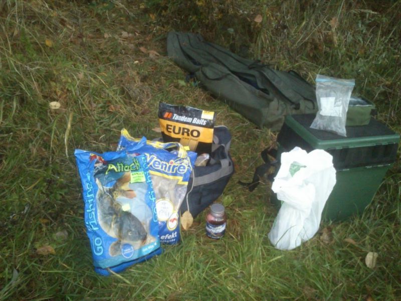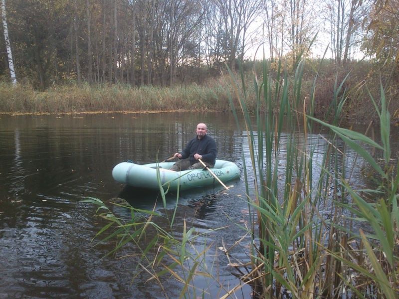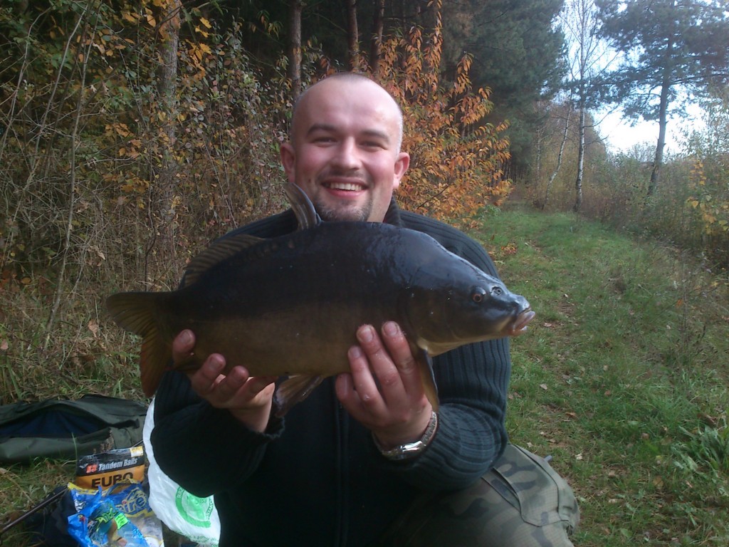 W niedzielę 27 października zaplanowałem z kolegą Darkiem wypad na ryby w godzinach od 6:00 do 13:00. Na miejscu stawiliśmy się planowo i przystąpiliśmy do rozkładania sprzętu. Jako że ostatnie łowy na kulki proteinowe nie przynosiły oczekiwanych efektów postanowiłem zamienić jedną z karpiówek na mojego feedera Mikado Trython 3,30m 100g. A drugą karpiówkę zostawić na zestawie który ostatnio przyniósł rezultat. Na wyprawie miałem również zamiar przetestować świeżo wykonaną podłogę listwową do mojego pontonu typu Czajka. Z racji ciemnej jeszcze pory do wywiezienia zestawów mieliśmy zamiar użyć łódki do wywózki Darka. Rozkładanie sprzętu rozpocząłem od przygotowanie trzech zanęt, pierwszą zanętą byłą Płoć Performance Gutkiewicza, wzbogacona o kastery i białe. Druga zanęta to mieszanka zanęty firmy Venire XXL karp o smaku halibuta i Gutkiewicza na ryby karpiowate z serii Attack również wzbogacona o białe i kastery. Trzecia zanęta to połówki kulek kukurydzianych 18mm firmy Tandembaits i halibutowych 18mm firmy Venire wzbogacona o kilka garści rybnego pelletu podlanych boosterem rak firmy Venire. Zestaw końcowy jaki zamontowałem na mojej karpiówce firmy JAXON CANTARA 3,90m 3,5lbs był wykonany na leadcore firmy Jaxon i ciężarku przelotowym romboidalnym firmy Jaxon o masie 70g. Przypon wykonałem w sposób klasyczny na haku numer 6 firmy Kamatsu dodając mały silikonowy stoperek na włos z racji zamiaru łowienia na grzybka, którego wykonałem odcinając 1/4 kulki kukurydzianej i dodając daszek z polówki kulki halibutowej. Zestaw został wywieziony wraz z dwoma garściami zanęty nr 3 pod nisko zwisające gałęzie na metrowy spadek ogólna głębokość około 2m. Następnie zająłem się feederem na który miałem zamiar połapać sobie płoteczki i wszystkie inne gatunki bytujące w wodzie. Feeder jak już wspominałem wyżej to mikado Trython 3,30m 100g uzbrojony w kołowrotek York Tontor 4004 i żyłkę firmy Dragon Super Camou 0,18mm. Przypon wykonałem na żyłce 0.12 MATH BALSAX i haku 12 Kamatsu. Na początek wykonałem kilka rzutów koszykiem zanętowym i zamocowałem właściwy 20g koszyk marki Jaxon, następnie dałem koralik silikonowy, 4 cm rurki termokurczliwej, koralik i krętlik do którego przymocowałem 15 cm przypon. Przyznam że od jakiś dwóch lat prawie zupełnie nie stosuje rurek anty splątaniowych. Po godzinie bez brań na feederze postanowiłem zmienić przypon na 0.16 i hak 10 na który nałożyłem trzy czerwone i zamocowałem do podpórki sygnalizator ponieważ miałem zamiar przetestować podłogę w pontonie. Więc przystąpiłem do pompowania środka pływającego i układania podłogi i ławek po 20 minutach ponton był gotowy do działania. Ponton postanowiłem przetestować na stawie obok aby nie płoszyć ryb jako że staw był wolny testy przeprowadziłem tam bez przeszkód przy okazji odhaczając kilka blach z trzcin. Przyniosłem ponton nad staw na którym łowiliśmy i zaproponowałem Darkowi aby sobie popływał, Darek skorzystał z propozycji i kiedy pomagałem mu się ulokować w pontonie, mój sygnalizator wydał najpiękniejszy dźwięk i wtórował mu przy tym wolny bieg kołowrotka który oddawał żyłkę w zawrotnym tempie. Błyskawicznie wdrapałem się na skarpę, pokonałem dzielące mnie od wędki 30m i zjechałem do wędki 3m w dół oczywiście na najszacowniejszej części ciała. Złapałem wędkę i uniosłem ją do góry jednocześnie wyłączając wolny bieg i wędka przyjemnie się ugięła. Jest ! krzyknąłem i rozpocząłem hol rybki która nagle ugrzęzła w roślinności jednak po chwili udało mi się wyprowadzić karpika z zawady. Poczułem ulgę że wyszedł i usłyszałem Darka który już był z podbierakiem obok mnie. Oczywiście karpiowy podbierak leżał sobie w pokrowcu a ja rozłożyłem swój wysłużony i podniszczony wiekowy podbieraczek. Jednak Darek po mistrzowsku poradził sobie z zmieszczeniem karpia do podbieraka i z powodzeniem wylądowaliśmy go na brzegu.