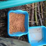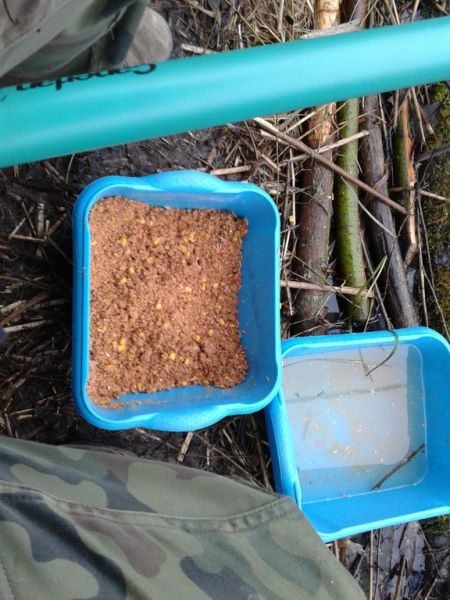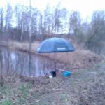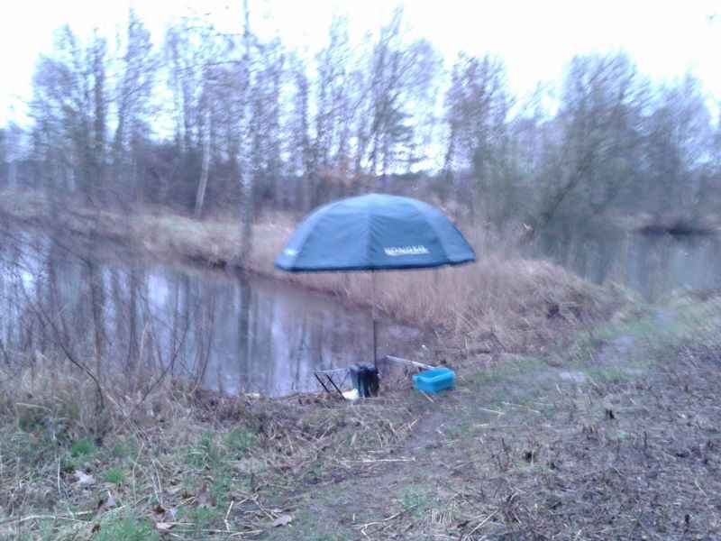 Wysiadłem z auta i obszedłem całą wodę dookoła zastanawiając się na co by tu połowić. Jako że całkiem niekorzystnie się rozpadało to zająłem stanowisko gdzie w sposób wygodny mogłem się rozbić z moim parasolem Konger i 7m batem. Koncepcję szybko zweryfikował łącznik żyłki który się odkleił z szczytówki nowego bata, więc zostałem przy mojej 5m marki Carpelan. Jako drugiego kijka użyłem feedera MIkado Trython 360 z 40g sprężyną i przyponem na żyłce 0,14 firmy Balsax z hakiem 12 Kamatsu. Za zanętę posłużyła zanęta na ryby karpiowate firmy Gut-Mix serii Attack z melasą waniliową Trapera, paczką białych, pinki i garścią kukurydzy.