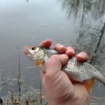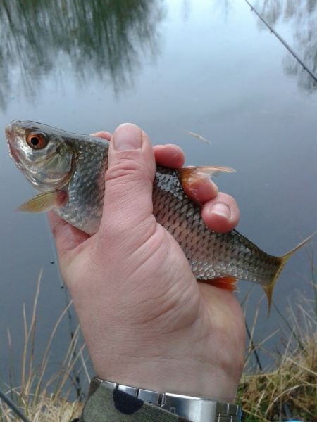 Feedera posłałem pod przeciwległy brzeg i zająłem się batem, wygruntowałem łowisko zanęciłem kilkoma kulkami zanęty i na pierwsze branie czekałem około czterdziestu minut i po zacięciu poczułem przyjemny ciężar na bacie i zaciekle walczącą rybę po chwili miałem już ją na brzegu była to całkiem słusznych rozmiarów wzdręga około 20 cm. Szybkie zdjęcie i wzdręgę do wody ponowny zarzut i zanęcenie. Czekam dłuższą chwilę i nic się nie dzieje, obserwuje sobie parzące się żaby które beztrosko się rozpłynęły po całej wodzie i nagle szczytówka feedera wpada w przyjemne dla oka drganie cięcie i wyciągam zestaw bez przekonania i widzę wzdręgę wielkości żyletki uwalniam maluszka i zarzucam ponownie czekam dalej nic się nie dzieje bat się nie odzywa zabieram się więc z kawkę . Az tu nagle woda pod moimi nogami eksploduje ja sam z wrażenia mało nie spadam ze stołka piękny zębaty atakuje z dobrym skutkiem żabę. Ciśnienie skacze na 200 i serce bije mocniej już wiem dlaczego nie było brań na bacie. Mam do 10 jeszcze godzinę i dwadzieścia minut szybka decyzja i zmiana miejscówki. Po 15 minutach jestem gotowy i wymoszczony na nowym miejscu zarzucam feedera i gruntuje łowisko pod pełny zestaw szybkie nęcenie i po chwili ładna płotka na bata siada krótka walka i plotkę do wody. Zakładam świeżą przynętę zestaw do wody i w kieszeni odzywa się telefon od małżonki z ponagleniem, więc pakuje się dynamicznie i wracam do moich kobiet które wyczekiwały mnie przy drzwiach wejściowych. Dziwnym trafem jak wróciłem z nad wody to pospałbym sobie jeszcze chwilkę jednak obowiązki nie pozwoliły na takie luksusy.