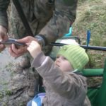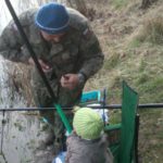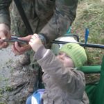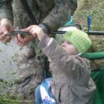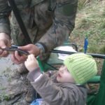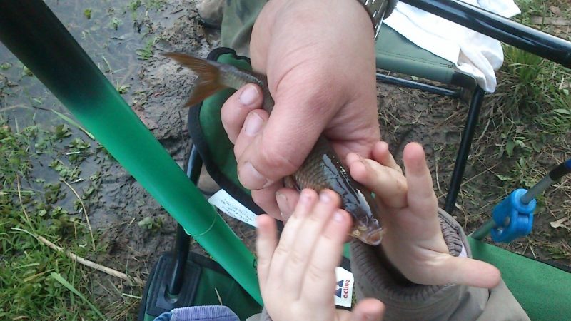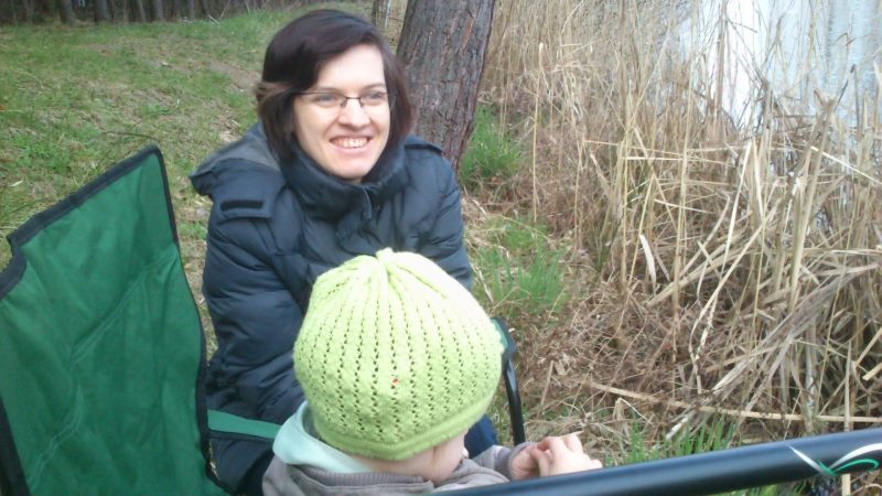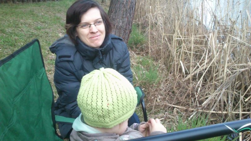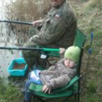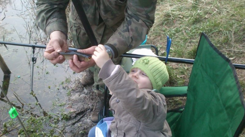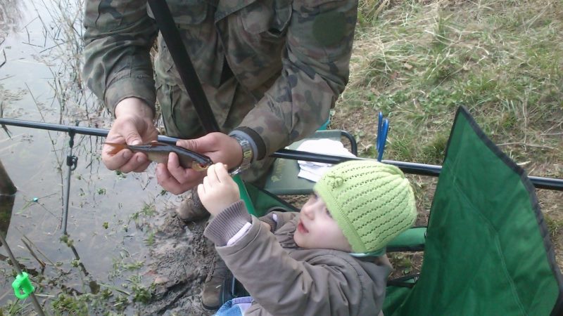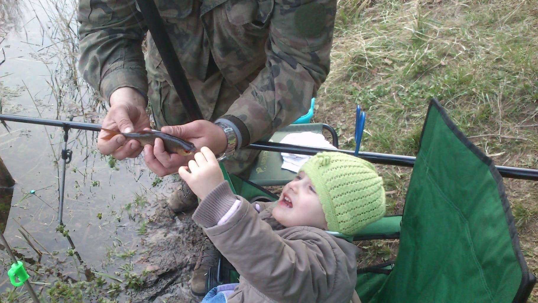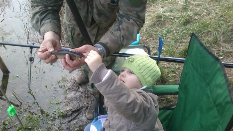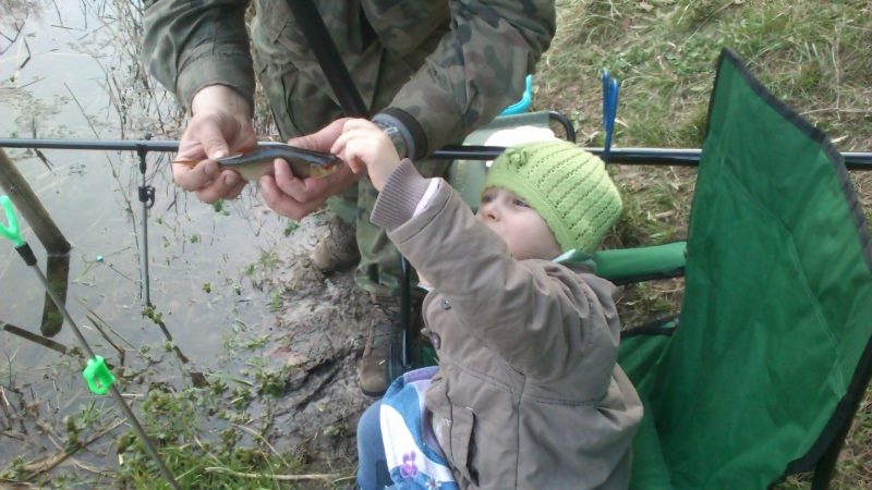Pierwszą płotkę złowiłem w trakcie pierwszego rzutu myślałem że źle wygruntowałem łowisko, a że musiałem zwracać uwagę na pociechę nie dostrzegłem brania w opadzie więc rybka ta wywołała lekkie zamieszanie na naszym rodzinnym łowisku bo wypychacz w kuferku i na skarpie z jednej strony dziecko domagające się uwolnienia rybki z drugiej strony brak w kieszeni wypychacza i starach aby dziecko nie wpadło do wody. Dobrze że nawinął się kolega Władek z synem i pomógł opanować sytuację za co mu dzięki składam. Po opanowaniu małego zamieszania i uratowania zestawu który zsunął się z klipsa zarzuciłem bata mojej córce posłałem kilka kulek zanęty na swój i jej zestaw i oddaliśmy się rodzinnemu wędkowaniu, stanowisko na dole skarpy znakomicie chroniło od wiatru i pozwalało cieszyć się promieniami słońca przyjemnie konwersowało się z małżonką i córką która swoje zainteresowanie przeniosła na pojemnik z zanętą i posyłała małe kulki na 40 cm łowiska. Nagle tą wielce interesującą czynność porzuciła i powiedziała abym usadził ją na krześle, po chwili wypaliła “tato czuję że coś złapię” i jak na komendę spławik poszedł pod wodę i Magda uniosła wędzisko do góry i wyholowała samodzielnie swoja pierwszą a zarazem życiową płotkę. Radość była ogromna rybka została z dotykana, pogłaskana, z fotografowana i na żądanie córki uwolniona. Niestety w między czasie słoneczko zaszło a i zestaw zaplątany w rosnące drzewo popsuł szyki bo przy próbie uwolnienia odkleił się klips do żyłki. Więc pozwijaliśmy sprzęt i wróciliśmy do domu gdzie Magda opowiedziała każdemu że złapała rybę i się tak cieszyła.