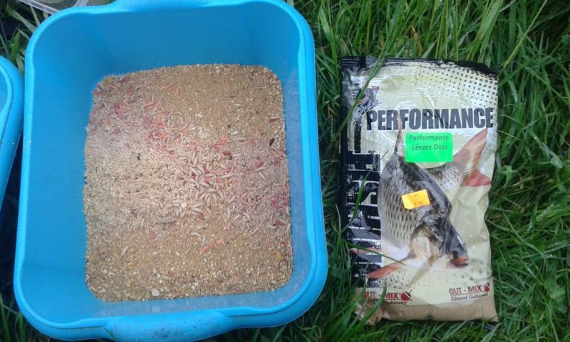 Jako zanęty użyłem zanęty firmy Gut-MIX PERFORMANCE Leszcz durzy dopalonej opakowaniem białych robaczków i opakowaniem pinki.
