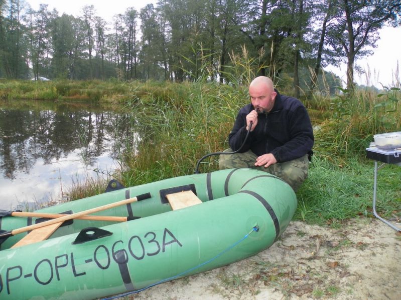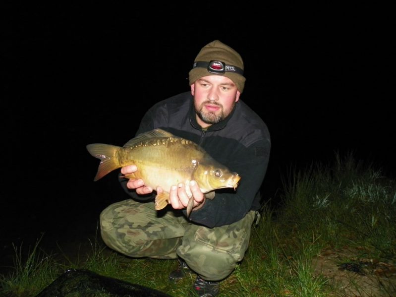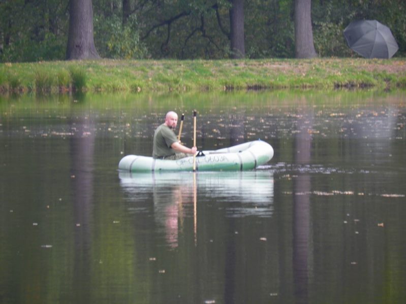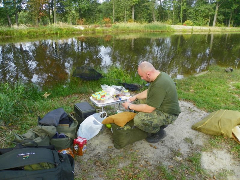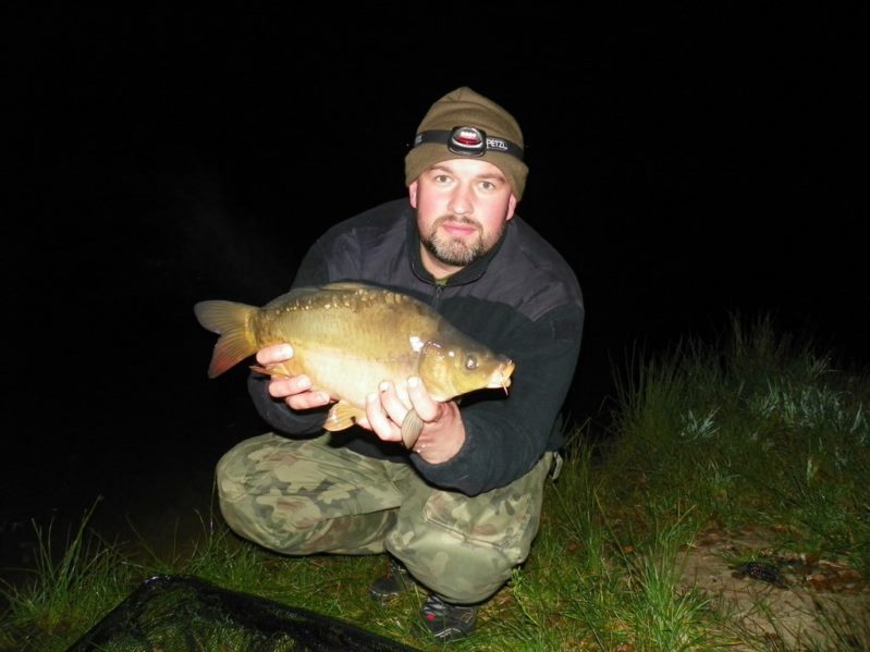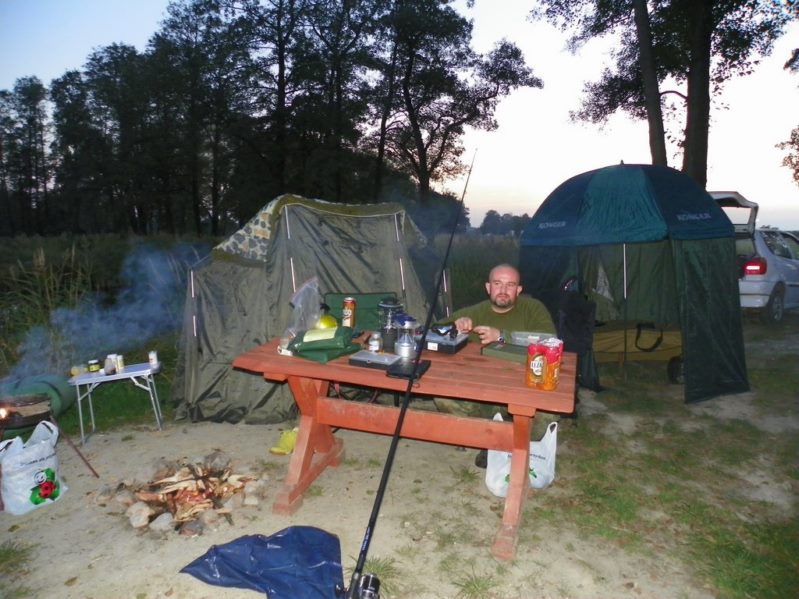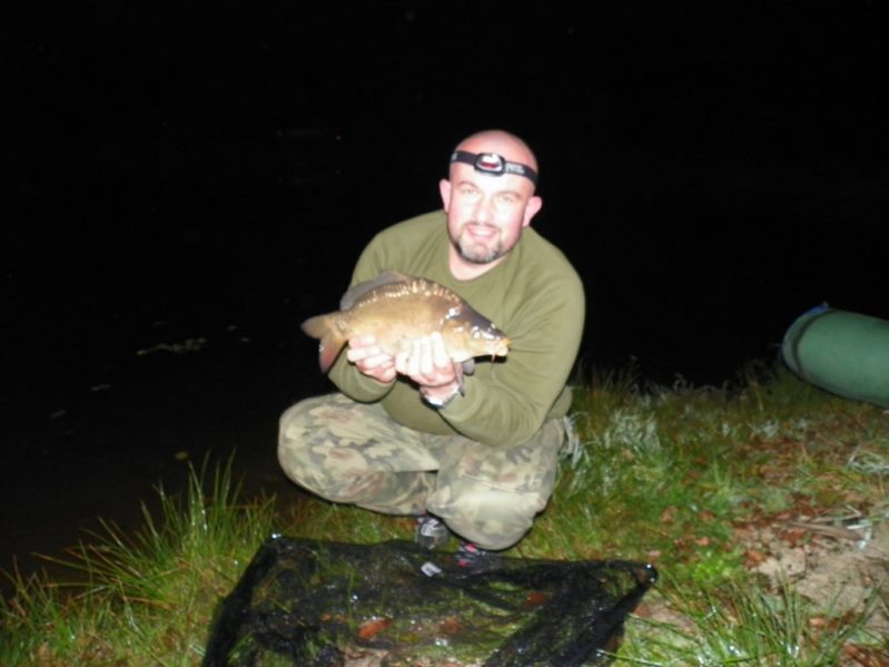Zestaw składał się z wędki Jaxon Extera Carp 3,90 3,5 lbs w trójskładzie oraz kołowrotka Robinson Feeder FD w rozmiarze 5000. Pozostałe dwa wędziska to Sanger Anaconda TEC Carp 2,75 lb 360 w wersji dwuskładowej i kołowrotki Sangner UNDERCOVER 6500. Jak dobrze policzymy to łowiłem po raz pierwszy w życiu na trzy wędziska na wstępie dodam ze raczej będzie to ostatni raz kiedy na jednym stojaku będą obsługiwane trzy kije ale o tym opowiem w dalszej części. Przygotowawszy wędziska ja zająłem się pompowaniem pontonu i przy tej czynności zauważyłem spadek wydajności miecha. Który złośliwie rozpadł się w połowie pompowania i czynność byłem zmuszony dokończyć przy użyciu własnych płuc. Jak domyślicie się chwilkę musiałem odpocząć po tej czynności strasznie kręciło mi się w głowie więc kilkanaście minutek spędziłem odpoczywając. Gdy wypocząłem dostatecznie wypłynąłem pontonem w celu przegruntowania łowiska i znalazłem ciekawa górkę i rów. Postanowiłem nęcić i łowić na stoku jak i na samej górce. Z powodu postu jaki miałem w połowach nastawiłem się na mniejsze okazy stosując na przynętę pellety kukurydze i małe pływaczki squid. Wypada też wspomnieć o zestawach końcowych jakie stosowałem przy połowach. Na pierwszym zestawie postawionym na kancie stoku zastosowałem chod-rig’a z pływającą kuleczką na drugim helikopterowym 15 centymetrowy przypon z systemem anti blow out dla nie wtajemniczonych z kłeczkiem które przesuwa się po trzonku haka a trzeci zestaw został uzbrojony w sztywnego łamańca na long shang’u . Zanęciłem mieszanką kukurydzy pelletów, demona i kulek proteinowych rozsypując zanętę dywanowo na większym obszarze. Zestawy umieszczałem z rzutu dodatkowo oblepiając ciężarki pastą z pelletu . Po umieszczeniu zestawów zająłem się organizacją spania i kolejną noc miałem zamiar spędzić pod parasolem konger’a jednak dodałem kawałek plandeki w okolicy stup aby nie obudzić się w razie deszczu z mokrymi nogami które maja tendencję do wystawania poza łóżko. I gdy tylko zakończyłem moszczenie miejscówki odezwał się sygnalizator na środkowej wędce. I po raz pierwszy poczułem rybę na nowej wędce przyznam ze mimo sporego lb ładnie pracowała i a ryba oscylowała coś w okolicy dwóch kilogramów. Po krótkim holu podebrałem rybkę i Darek uwiecznił wszystko filmując aparatem jednak jeszcze nie dorosłem chyba do zamieszczania filmów w sieci z moich wypraw. Powiem że pomimo niewielkiej ryby banan nie schodził mi z twarzy. Przerzuciłem zestawy i wraz z Darkiem zabraliśmy się za kolację którą zrobiliśmy sobie na grillu odgrzewając gotowe skrzydełka kiełbaski i całość dopełniając niezłym serkiem pleśniowym który robił za deser. Syci oddaliśmy się wędkarskim pogaduchą wymieniając się informacjami i żartując. Jako że miałem niezłe braki w śnie postanowiłem się w okolicach północy udać na spoczynek jednak nie dane było mi wiele pospać bo gdy tylko zasnąłem dźwięk sygnalizatora wyrwał mnie brutalnie ze snu. Podjąłem walkę z karpiem który może miał 1,5 kilograma a może nie i po paru chwilkach podebrałem koleżkę . Po szybkim zdjęciu wypuściłem maluszka i wróciłem do spania. Gdy tylko zasnąłem znów odjazd tym razem ponownie na wędkę ze stajni Jaxon hol i karpiczka podebrałem w rękę foteczka i przerzucenie zestawów . Do łózka, tym razem śpię w butach nie zdążyłem zasnąć znowu dźwięk sygnalizatora. Jest wspaniale gdy holuję karpika do brzegu i ląduję w podbieraku plącze on jeden zestaw a na trzecim zaliczam odjazd . Pierwszą wędkę odkładam na ziemię i zaczynam hol kolejnej rybki dublecik myślę sobie. Uśmiech nie z chodzi mi z twarzy nawet gdy rybka się spina. Około godziny zajmuje mi uporządkowanie bałaganu który wytworzył się w czasie holu i rozplątywania zestawów. Jak ogarnąłem stanowisko to założyłem bardziej selektywne przynęty. Dzięki czemu przespałem spokojnie resztę nocy. Wstałem parę chwil po godzinie 6 czyli o godzinie 8. Obowiązki przygotowania śniadania przyjąłem na klatę ja i na poranny posiłek zaserwowałem po wojskowej racji suchej w wersji SRG-9 z bigosem i karbitowym podgrzewaczem uzupełnioną o kiełbaski z grilla jako taką małą atrakcję. Oczywiście d o picia aromatyczna kawka, której aromat potrafi wyciągnąć każdego śpiocha ze śpiwora. Po śniadaniu, postanowiłem powalczyć jeszcze z rybkami więc wróciłem do pelletów i kukurydzy . Branie miałem już w ciągu minuty po wrzuceniu pierwszej wędki. Ryby współpracowały wspaniale. Wpadłem więc na pomysł pokombinowania z wszelkiej maści smakami przynęt. Na włos wędrowały wszelkich smaków kuleczki i również na nie miałem brania. Zabawa trwała w najlepsze aż spojrzałem na kawałek chleba pozostałego po śniadaniu . Chleb jako przynęta spisał się najlepiej brania były dosłownie kilkanaście sekund po zarzuceniu. Nałowiwszy się maluchów do syta przestałem się wygłupiać i wróciłem do selektywnych przynęt. Podsumowując to ryb na brzegu miałem ponad 10. Największa miała coś koło 3 kilogramów a przeważały takie w okolicy 1,5 kg. Wyłowiłem się do syta i nacieszyłem atmosferą tego miejsca . Rano pogawędziłem z właścicielami i w okolicach 14 zwinęliśmy sprzęt i wróciliśmy do domu.