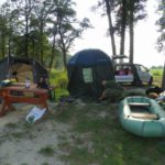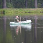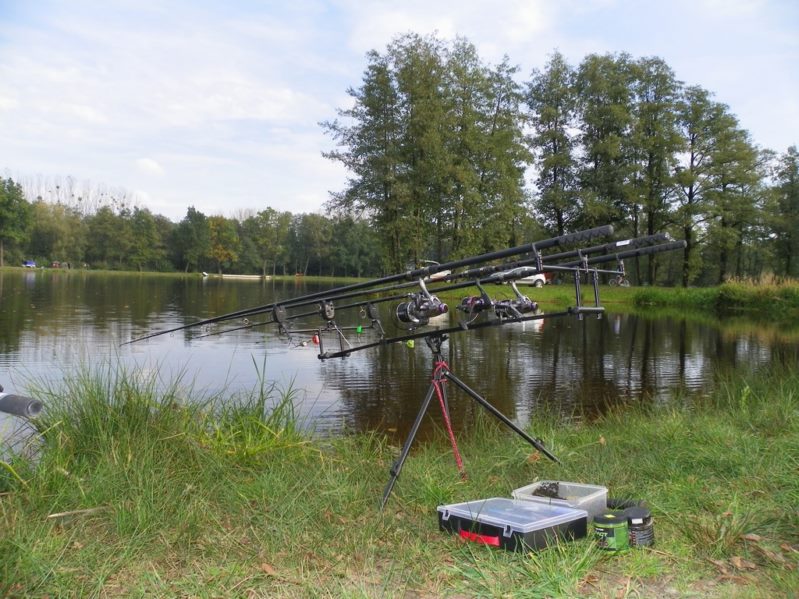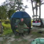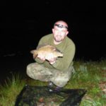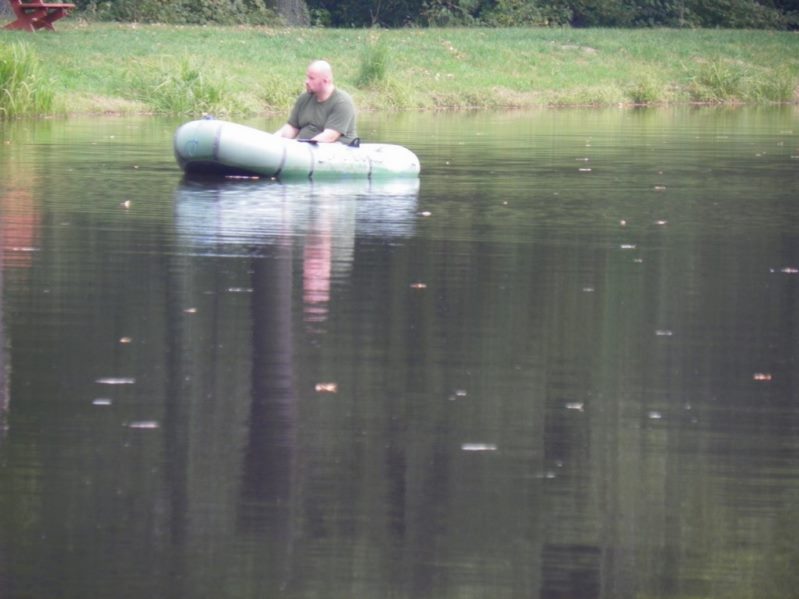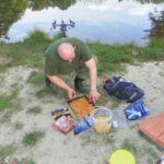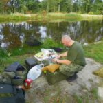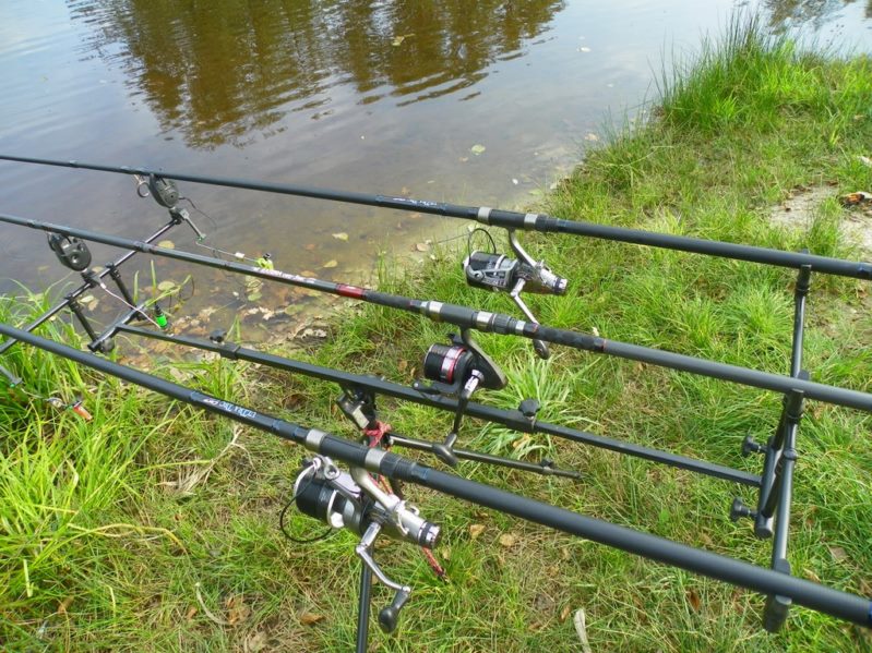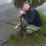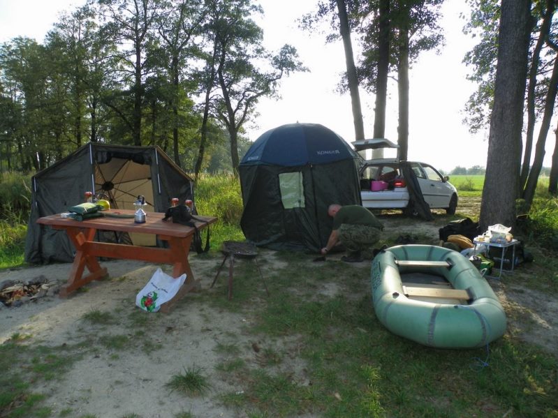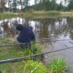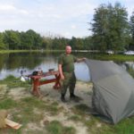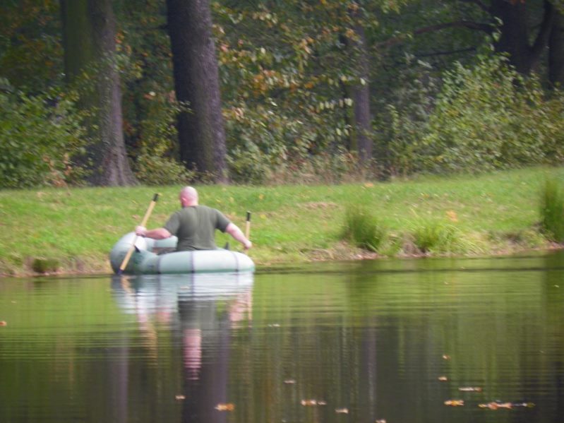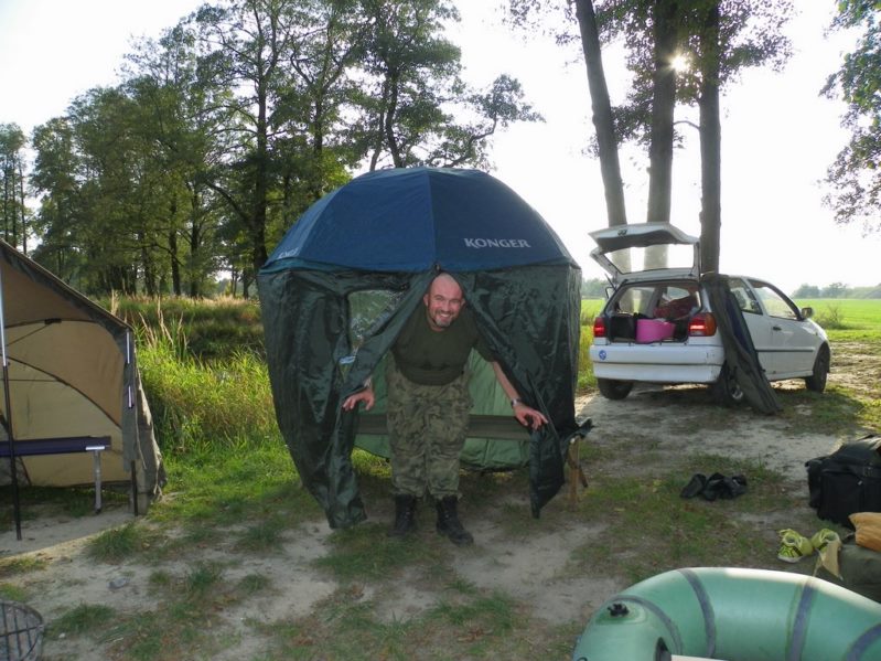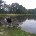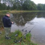 Zestaw składał się z wędki Jaxon Extera Carp 3,90 3,5 lbs w trójskładzie oraz kołowrotka Robinson Feeder FD w rozmiarze 5000. Pozostałe dwa wędziska to Sanger Anaconda TEC Carp 2,75 lb 360 w wersji dwuskładowej i kołowrotki Sangner UNDERCOVER 6500. Jak dobrze policzymy to łowiłem po raz pierwszy w życiu na trzy wędziska na wstępie dodam ze raczej będzie to ostatni raz kiedy na jednym stojaku będą obsługiwane trzy kije ale o tym opowiem w dalszej części. Przygotowawszy wędziska ja zająłem się pompowaniem pontonu i przy tej czynności zauważyłem spadek wydajności miecha. Który złośliwie rozpadł się w połowie pompowania i czynność byłem zmuszony dokończyć przy użyciu własnych płuc. Jak domyślicie się chwilkę musiałem odpocząć po tej czynności strasznie kręciło mi się w głowie więc kilkanaście minutek spędziłem odpoczywając. Gdy wypocząłem dostatecznie wypłynąłem pontonem w celu przegruntowania łowiska i znalazłem ciekawa górkę i rów. Postanowiłem nęcić i łowić na stoku jak i na samej górce. Z powodu postu jaki miałem w połowach nastawiłem się na mniejsze okazy stosując na przynętę pellety kukurydze i małe pływaczki squid. Wypada też wspomnieć o zestawach końcowych jakie stosowałem przy połowach. Na pierwszym zestawie postawionym na kancie stoku zastosowałem chod-rig’a z pływającą kuleczką na drugim helikopterowym 15 centymetrowy przypon z systemem anti blow out dla nie wtajemniczonych z kłeczkiem które przesuwa się po trzonku haka a trzeci zestaw został uzbrojony w sztywnego łamańca na long shang’u . Zanęciłem mieszanką kukurydzy pelletów, demona i kulek proteinowych rozsypując zanętę dywanowo na większym obszarze. Zestawy umieszczałem z rzutu dodatkowo oblepiając ciężarki pastą z pelletu . Po umieszczeniu zestawów zająłem się organizacją spania i kolejną noc miałem zamiar spędzić pod parasolem konger’a jednak dodałem kawałek plandeki w okolicy stup aby nie obudzić się w razie deszczu z mokrymi nogami które maja tendencję do wystawania poza łóżko. I gdy tylko zakończyłem moszczenie miejscówki odezwał się sygnalizator na środkowej wędce. I po raz pierwszy poczułem rybę na nowej wędce przyznam ze mimo sporego lb ładnie pracowała i a ryba oscylowała coś w okolicy dwóch kilogramów. Po krótkim holu podebrałem rybkę i Darek uwiecznił wszystko filmując aparatem jednak jeszcze nie dorosłem chyba do zamieszczania filmów w sieci z moich wypraw. Powiem że pomimo niewielkiej ryby banan nie schodził mi z twarzy. Przerzuciłem zestawy i wraz z Darkiem zabraliśmy się za kolację którą zrobiliśmy sobie na grillu odgrzewając gotowe skrzydełka kiełbaski i całość dopełniając niezłym serkiem pleśniowym który robił za deser. Syci oddaliśmy się wędkarskim pogaduchą wymieniając się informacjami i żartując. Jako że miałem niezłe braki w śnie postanowiłem się w okolicach północy udać na spoczynek jednak nie dane było mi wiele pospać bo gdy tylko zasnąłem dźwięk sygnalizatora wyrwał mnie brutalnie ze snu. Podjąłem walkę z karpiem który może miał 1,5 kilograma a może nie i po paru chwilkach podebrałem koleżkę . Po szybkim zdjęciu wypuściłem maluszka i wróciłem do spania. Gdy tylko zasnąłem znów odjazd tym razem ponownie na wędkę ze stajni Jaxon hol i karpiczka podebrałem w rękę foteczka i przerzucenie zestawów . Do łózka, tym razem śpię w butach nie zdążyłem zasnąć znowu dźwięk sygnalizatora. Jest wspaniale gdy holuję karpika do brzegu i ląduję w podbieraku plącze on jeden zestaw a na trzecim zaliczam odjazd . Pierwszą wędkę odkładam na ziemię i zaczynam hol kolejnej rybki dublecik myślę sobie. Uśmiech nie z chodzi mi z twarzy nawet gdy rybka się spina. Około godziny zajmuje mi uporządkowanie bałaganu który wytworzył się w czasie holu i rozplątywania zestawów. Jak ogarnąłem stanowisko to założyłem bardziej selektywne przynęty. Dzięki czemu przespałem spokojnie resztę nocy. Wstałem parę chwil po godzinie 6 czyli o godzinie 8. Obowiązki przygotowania śniadania przyjąłem na klatę ja i na poranny posiłek zaserwowałem po wojskowej racji suchej w wersji SRG-9 z bigosem i karbitowym podgrzewaczem uzupełnioną o kiełbaski z grilla jako taką małą atrakcję. Oczywiście d o picia aromatyczna kawka, której aromat potrafi wyciągnąć każdego śpiocha ze śpiwora. Po śniadaniu, postanowiłem powalczyć jeszcze z rybkami więc wróciłem do pelletów i kukurydzy . Branie miałem już w ciągu minuty po wrzuceniu pierwszej wędki. Ryby współpracowały wspaniale. Wpadłem więc na pomysł pokombinowania z wszelkiej maści smakami przynęt. Na włos wędrowały wszelkich smaków kuleczki i również na nie miałem brania. Zabawa trwała w najlepsze aż spojrzałem na kawałek chleba pozostałego po śniadaniu . Chleb jako przynęta spisał się najlepiej brania były dosłownie kilkanaście sekund po zarzuceniu. Nałowiwszy się maluchów do syta przestałem się wygłupiać i wróciłem do selektywnych przynęt. Podsumowując to ryb na brzegu miałem ponad 10. Największa miała coś koło 3 kilogramów a przeważały takie w okolicy 1,5 kg. Wyłowiłem się do syta i nacieszyłem atmosferą tego miejsca . Rano pogawędziłem z właścicielami i w okolicach 14 zwinęliśmy sprzęt i wróciliśmy do domu.