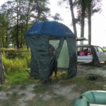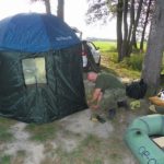 Musze oddać mu to że dzielnie się spisuje nie widać na nim żadnych przebarwień i wydaje się być dalej solidny. Dolana część sztycy pokryła się jednak rdzą a nieostrożne używanie pręta do wkręcania powoduje odkształcenie sztycy i problemy przy przesuwaniu. Również plastykowa blokada służąca do ustalania wysokości parasola lubi się otworzyć i wtedy parasol bez ostrzeżenia zjeżdża na dół. Parasole maja jeszcze tę wadę że są mało odporne na wiatr i wymagają dodatkowych wzmocnień w postaci wspomnianych przeze mnie linek stabilizujących. I właśnie brak odporności na wiatr zmusił mnie do zakupu namiotu karpiowego. Mimo wszystko mogę mu dać mocną ocenę cztery za trwałość i parametry użytkowe, mam również nadzieję że będzie mi dalej dzielnie służył na krótkich wypadach jako schronienie i osłona zarówno na rybach jak i w czasie plażowania z rodziną.