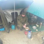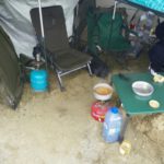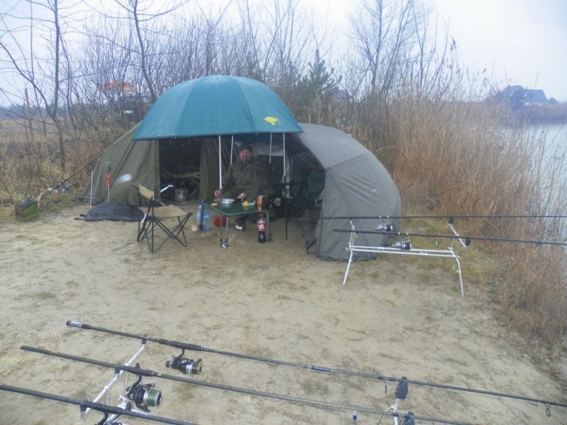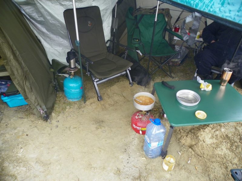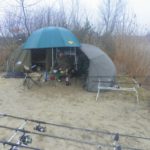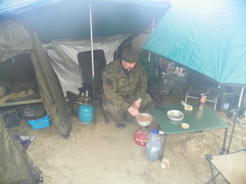 Gdy zyskaliśmy sensowne i suche schronienie przystąpiłem na spokojne do montażu stanowiska karpiowego które nabyłem za całkiem przyzwoite pieniądze na ulubionym serwisie aukcyjnym. Następnie przygotowałem wędziska i radośnie w czasie opadu deszczu sugerując się wskazówkami bardziej obłowionych kolegów wytypowałem miejsce do położenia zestawów.