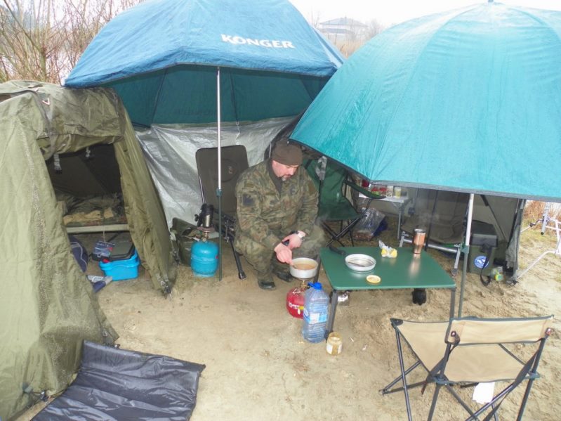 Mając już niemałą wprawę w ciągu kilku chwil zaplanowaliśmy rozkład obozowiska i przystąpiliśmy do jego wznoszenia. Na pierwszy ogień poszedł mój najnowszy nabytek w dziedzinie biwakowania namiot Sanger z serii Anaconda Moon Braker, następnie brolly Dariusza a całość wykończyliśmy rozkładając dwa parasole wędkarskie i plandekę . Całość naszego obozowiska i jego koncepcję możecie podziwiać na zdjęciach więc nie będę się więcej nad nim rozwodził.