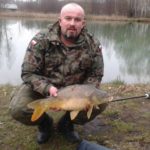 Stałem się nieco senny gdy moją uwagę zwrócił wiszący swobodnie hanger. Rad nie rad musiałem poprawić hangera przy okazji zauważyłem ze nie trafiłem żyłką w rowek sygnalizatora. Poprawiłem błędy i już wstawałem od stojaka gdy sygnalizator wydal piknięcie które początkowo zignorowałem jednak gdy już wydał szybkie dwa kolejne zaciąłem. I wtedy na mojej twarzy zagościł wędkarski uśmiech nr 7. Nieśpiesznie powoli i z namaszczeniem rozpocząłem hol. Ryba chyba wyczuła brak pośpiechu z mojej strony i majestatyczne zataczała koła. Ja podholowałem ją na tyle by ocenić jej wagę na jakieś cztery kilogramy. Bojąc się o to by na śliskim gliniastym podłożu nie wykapać się razem z rybą podholowałem ją wzdłuż brzegu w bardziej dogodne do podebrania miejsce. Spokojnie wprowadziłem rybę do podbieraka i zaniosłem mojego pierwszego karpia w sezonie 2015 na matę.