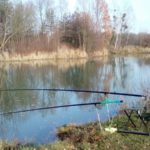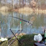 Szybkie rozłożenie sprzętu i do wody trafił pierwszy pięcio metrowy bat z racji tego że był na nim gotowy zestaw. Szybkie sondowanie dna określenie gruntu i w ślad za zestawem poszybowały dwie kulki zanęty która świetnie przechowała się od ostatniego wypadu na spławik. Zapewne przechowała się w tak dobrym stanie z racji niskich temperatur. Zabrałem się za błyskawiczną budowę drugiego zestawu, zasadniczo nie lubię robić tego nad wodą ale jak to się popularnie zwykło mawiać „ No życie”. Zanim doważyłem drugi zestaw miałem już na rozkładzie trzy żyletki na pięcio metrowego bata.