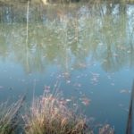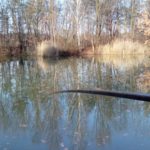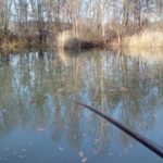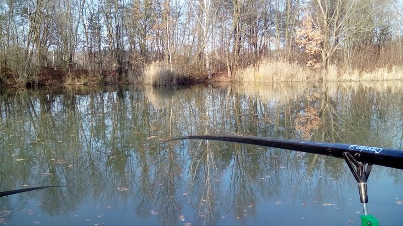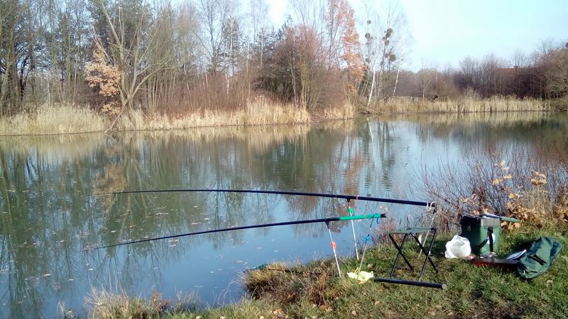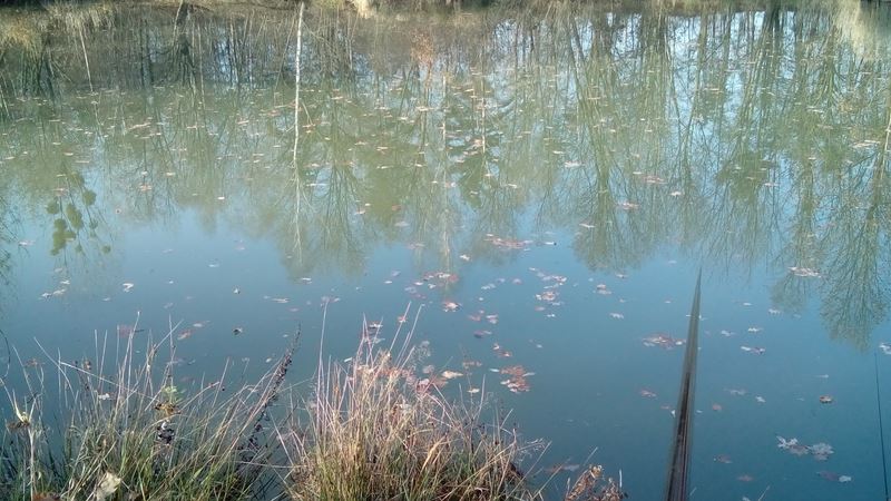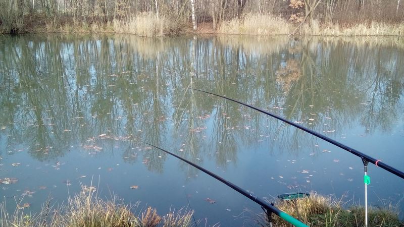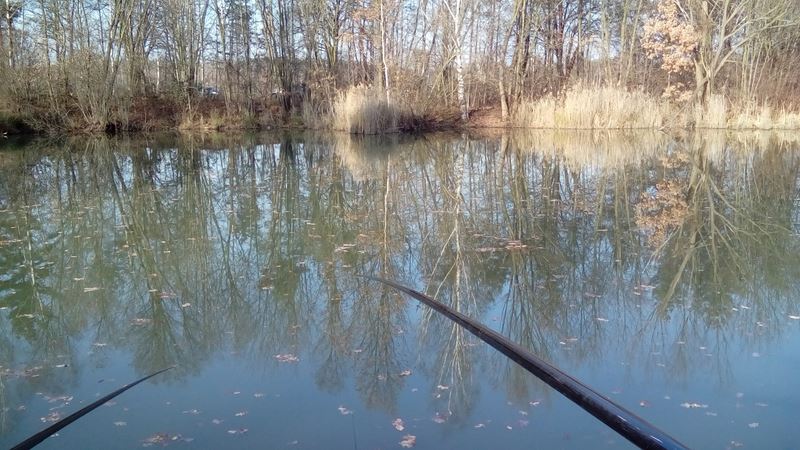 Po chwili dzielnie gruntowałem łowisko na jedenastym metrze od brzegu i wygruntowawszy na styk z dnem posłałem większą cześć zanęty na spławik. W końcu mogłem wygodnie się rozsiąść i zająć mikro relaksem z uwagą obserwując antenki spławika. Pech chciał że delikatna ale kąsająca chłodem bryza nawiała liści głównie dębowych w zanęcony obszar i byłem zmuszony męczyć się co chwila z przerzucaniem zestawów i oczywiście utrudniało to prawidłową sygnalizacje brań.