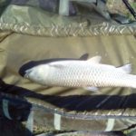 Z racji tego że dwa dni wcześniej obiecałem sobie święta bez facebooka i telefonu aby uprzyjemnić sobie czas zabrałem ze sobą książkę elektroniczną i zapadłem w lekturze. Po jakiejś godzinnie atomowy odjazd na lewym kiju wyrwał mnie z odrętwienia. Przytrzymując szpulę powalczyłem chwilę z hamulcem kołowrotka było to wynikiem rezygnacji z wolnych biegów szpul i przejście na inne kołowrotki. Po ułamku sekundy po holu rozpoznałem już gatunek ryby słusznie zresztą okazało na zestawie zapiął się amur. Kto łowił amury wie, że najlepsze zaczyna się na krótkiej żyłce walka była wspaniałą i ryba w znakomitej kondycji odjeżdżała pięć razy prawie na połowę stawu. Amura poddałem szybko ważeniu fotografowaniu i zabiegom dezynfekcyjnym i szybciutko zwróciłem mu wolność rybka majestatycznie zniknęła w wodach łowiska a ja ucieszony wspinałem się na wysoki brzeg łowiska. Myślałem sobie że dostałem swojego zajączka na Wielkanoc i już mogę wracać do domu. Ale jak to się mawia zajączki maja dwa uszka i w momencie, gdy postawiłem stopę na krawędzi skarpy nastąpił odjazd na drugiej wędce.