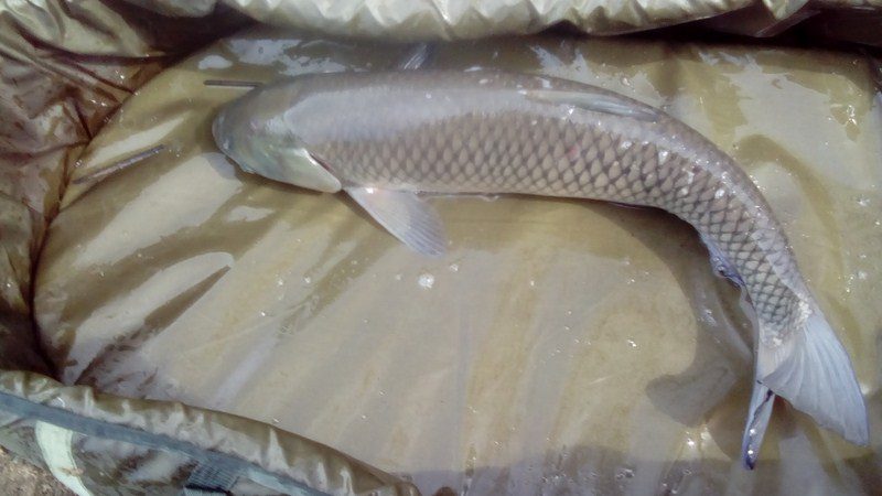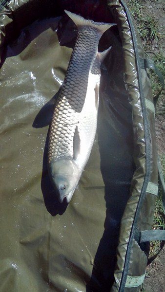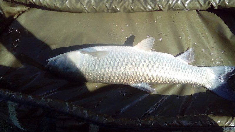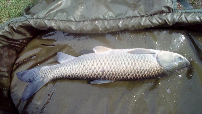 Z racji tego że dwa dni wcześniej obiecałem sobie święta bez facebooka i telefonu aby uprzyjemnić sobie czas zabrałem ze sobą książkę elektroniczną i zapadłem w lekturze. Po jakiejś godzinnie atomowy odjazd na lewym kiju wyrwał mnie z odrętwienia. Przytrzymując szpulę powalczyłem chwilę z hamulcem kołowrotka było to wynikiem rezygnacji z wolnych biegów szpul i przejście na inne kołowrotki. Po ułamku sekundy po holu rozpoznałem już gatunek ryby słusznie zresztą okazało na zestawie zapiął się amur. Kto łowił amury wie, że najlepsze zaczyna się na krótkiej żyłce walka była wspaniałą i ryba w znakomitej kondycji odjeżdżała pięć razy prawie na połowę stawu. Amura poddałem szybko ważeniu fotografowaniu i zabiegom dezynfekcyjnym i szybciutko zwróciłem mu wolność rybka majestatycznie zniknęła w wodach łowiska a ja ucieszony wspinałem się na wysoki brzeg łowiska. Myślałem sobie że dostałem swojego zajączka na Wielkanoc i już mogę wracać do domu. Ale jak to się mawia zajączki maja dwa uszka i w momencie, gdy postawiłem stopę na krawędzi skarpy nastąpił odjazd na drugiej wędce.