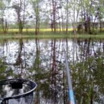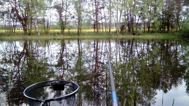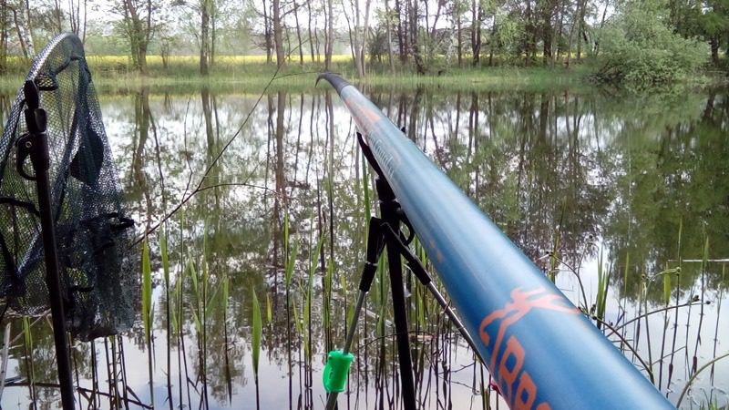Miałem więc przed sobą około trzech godzin dla siebie postanowiłem więc potrenować wędkowanie przy użyciu mojej jedenasto metrowej tyczki . Przygotowania do łowienia wędziskiem wyczynowym zajmują chwilę więc po jakiś czterdziestu minutach byłem rozstawiony. Z racji sporej obecności wędkarzy na łowisku byłem zmuszony zająć miejsce na którym na zawodach zasiadał kolega Adrian i pokazał klasę wędkarską. Wygruntowałem łowisko i okazało się że byłem zmuszony dokonać jedynie centymetrowej korekty spławika. Bardzo skoncentrowałem się na podaniu zanęty w punkt i po całych tych ciężkich pracach rozsiadłem się na stołku i rozpocząłem wpatrywanie się w spławik.
