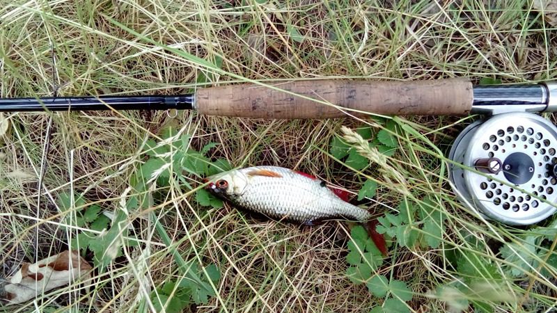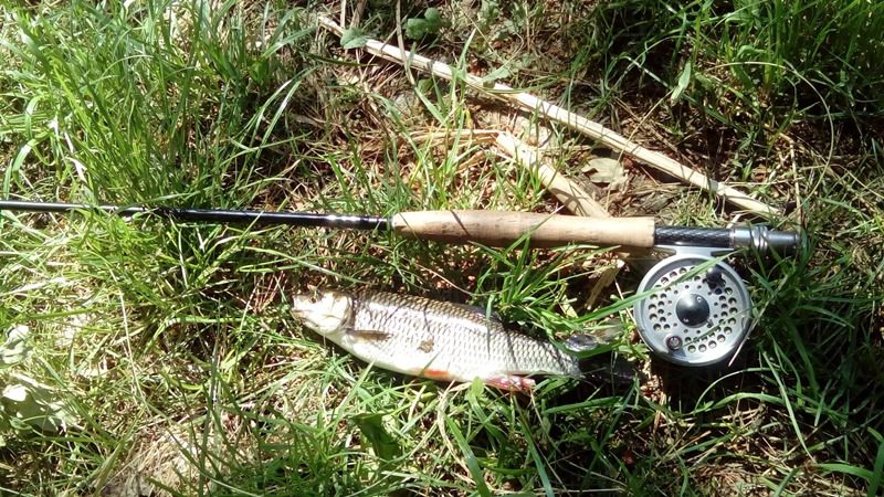 Obchodząc zbiornik na około zauważyłem klenia który stał nie opodal moczarki i co jakiś czas zbierał jakieś pyłki  z wody. Posłałem więc muszkę w jego kierunku co o dziwo wyszło dosyć zgrabnie i delikatnie podszarpując sznurem nadałem jej ruch przypominający ruch owada który wpadł do wody. Reakcja ryby była natychmiastowa i nastąpiła całkiem przyjemna walka. Na delikatnym wędzisku wszystko odczuwało się bardzo przyjemnie wiec po chwili wyślizgiem na brzegu dał się sfotografować klenik.