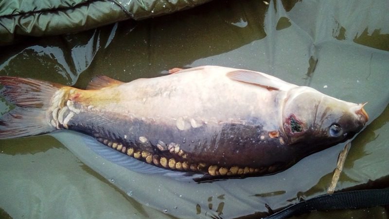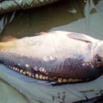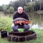 Uniosłem moje wędzisko i z racji używania plecionek rozpocząłem delikatny i przyjemny hol z 70 metrów. Początkowo wszystko przebiegało gładko ryba zataczała przyjemne kręgi i ładnie współpracowała.  Najlepsze chwile holu odbyły się na trzech długościach wędki gdy ładny karpik postanowił że musze zapracować na zdjęcie z jego udziałem. I kilka razy odjechał i za nic w świecie nie chciał dać wprowadzić się do podbieraka. W końcu udało więc niezwykle walecznego osobnika wprowadzić do siatki. Odłożyłem wędkę karpia umieściłem w macie  i przez chwilę łapałem oddech. Na oko karp miał coś około pięciu kilo i wydawał się dziwnie znajomy. Na macie karpik strasznie dokazywał i broił nie chcąc ładnie zapozować raz nawet prawie opuścił matę w końcu udało się całość operacji robienia zdjęcia doprowadzić do końca i nieco niezdarnie ze zbyt wyeksponowanymi rękoma udało mi się uwiecznić rybę na zdjęciu.