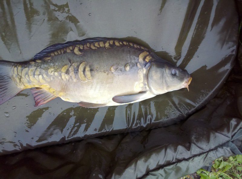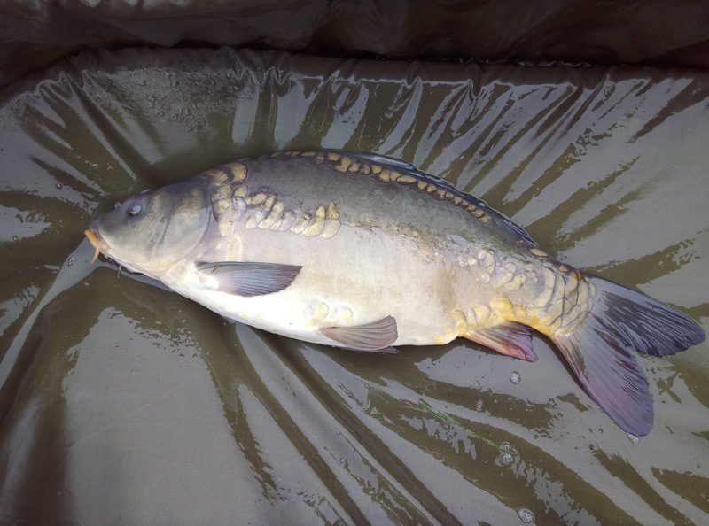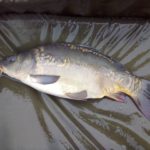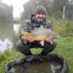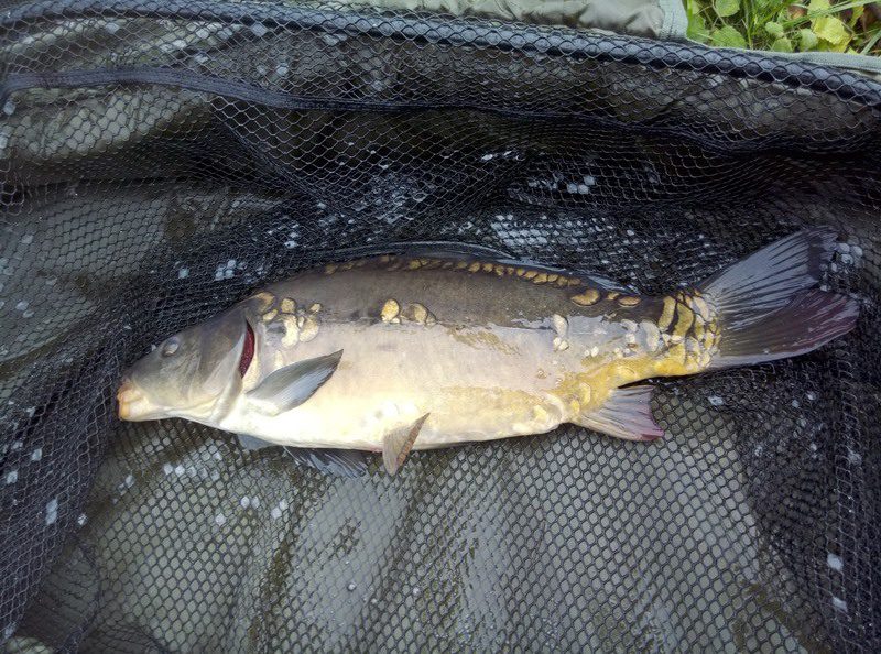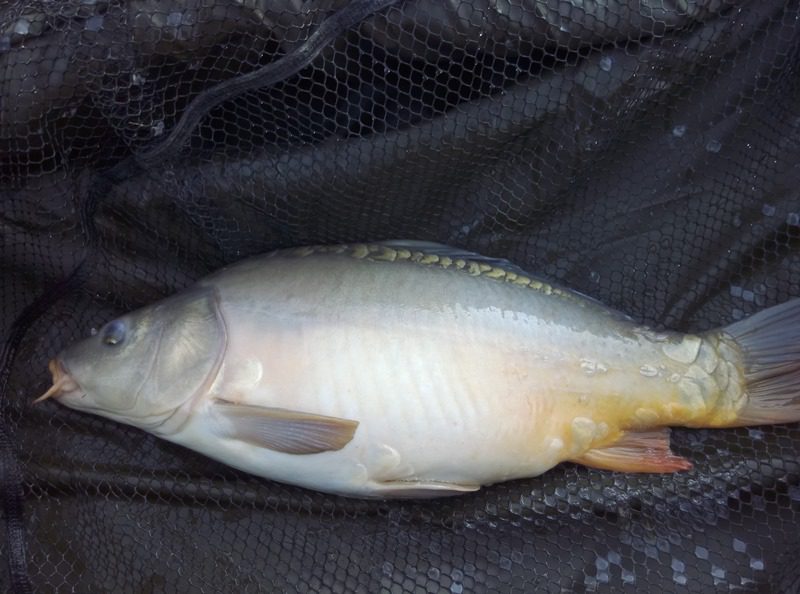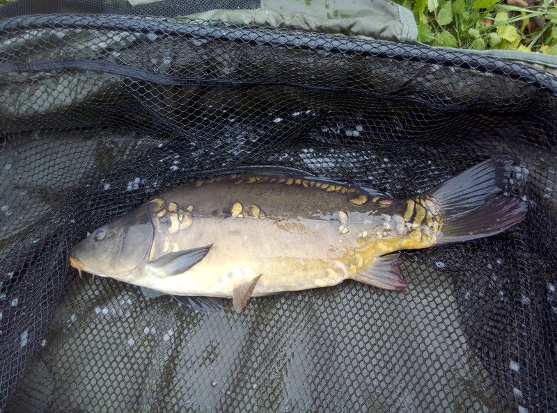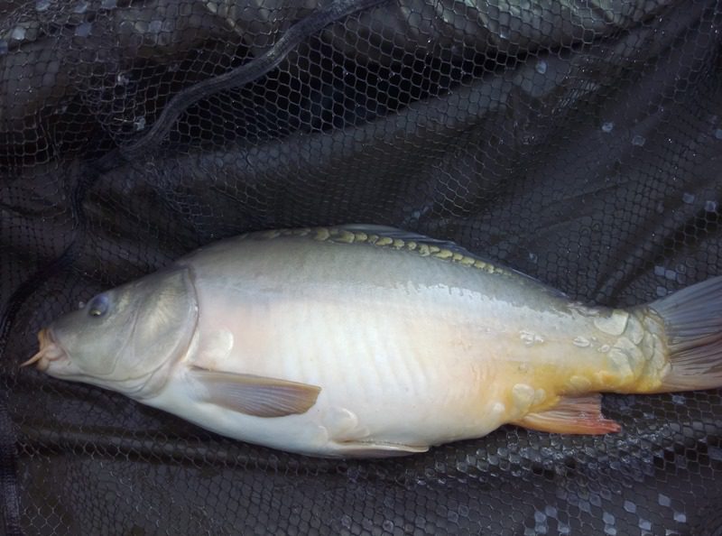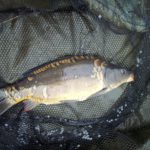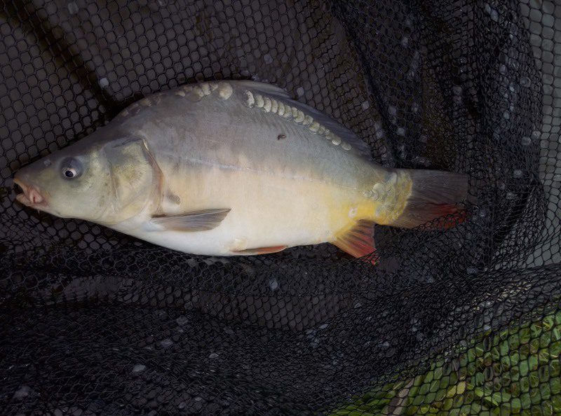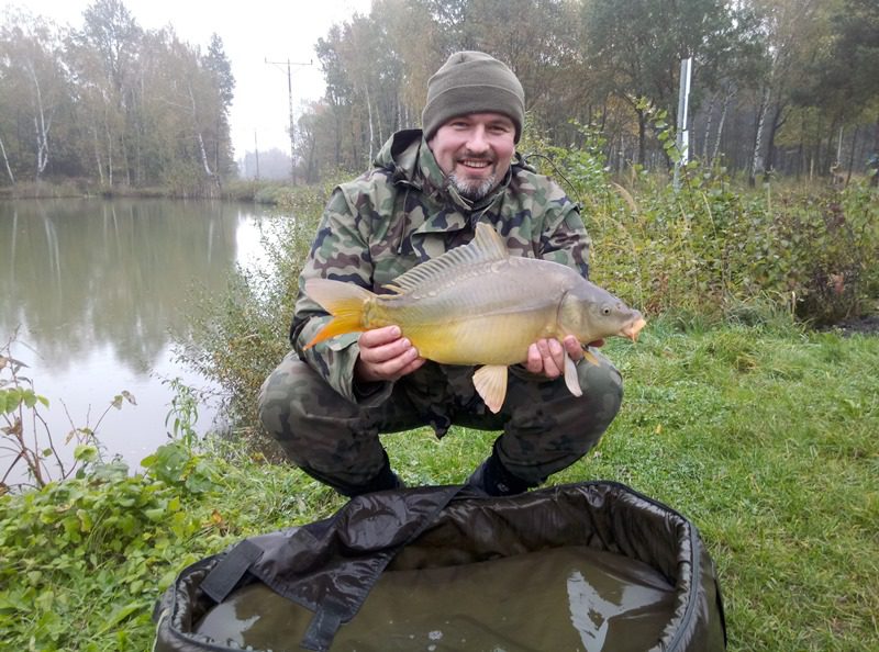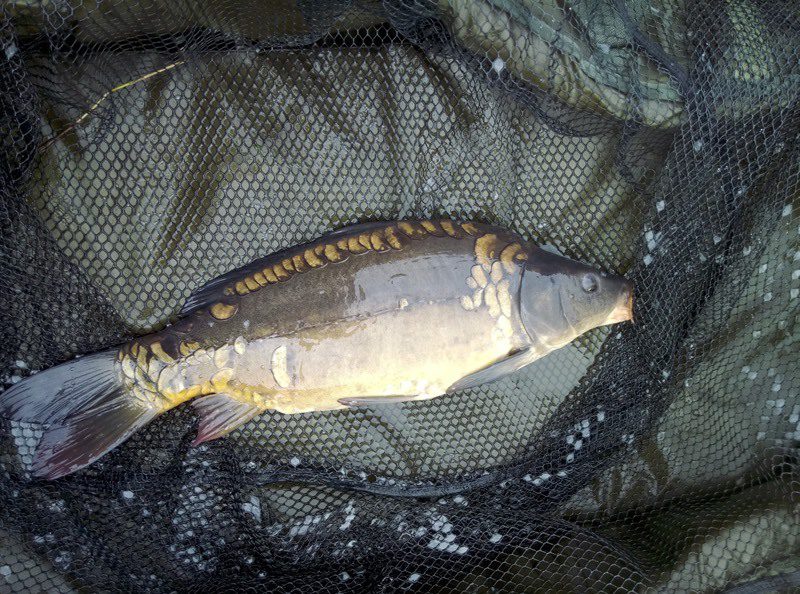 W czasie gdy odwiedził mnie kolega Kazik odnotowałem ładny odjazd i na małym haku nr 8 udało się doholować karpika w okolicach trzech kilogramów.  Ryba w fantastycznej kondycji zmusiła mnie do wysiłku zanim udało wprowadzić się ją do podbieraka. Po szybkim zdjęciu ponownie przerzuciłem zestaw i pożegnawszy się z Kazikiem którego obowiązki domowe wzywały oddałem się ponownie relaksowi. Relaks przerywany był braniami które jednak nie kończyły się rybom na brzegu. Zawiązałem więc inne haki i po tej małej zmianie na brzegu chwilę później zagościł kolejny zimny karpik.  W okolicach godziny dwunastej nastąpiła chwilowa stagnacja aż do czternastej gdzie na przysłowiowe dowiedzenia  wody glinianki obdarzyły mnie kolejnymi braniami.