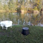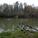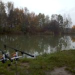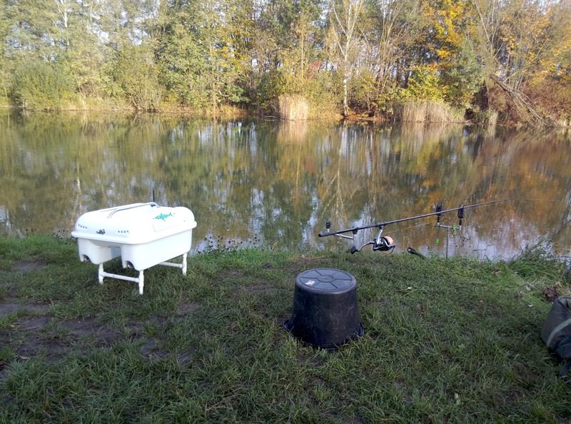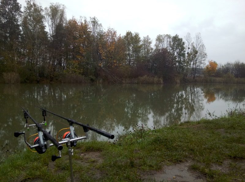 Dwudziestego piątego października punktualnie o piątej zero zabierałem się za rozbijanie stanowiska w chwilę później wybadałem odległość na której od mojego miejsca stania znajduje się wał na dnie i odznaczyłem ją na brzegu nie chciało mi się użytkować tyczek wolałem szybki spacer po przyległej do łowiska łące.  Podparłem moje zestawy niewielkimi workami PVA i posłałem na spadek wału. W aucie z racji niskich temperatur uruchomiłem moje gazowe słoneczko i ciesząc się ciepłem i smakiem świeżo parzonej kawy.