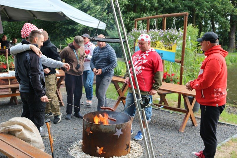 W końcu doczekałem się niedzieli dwudziestego czwartego czerwca i już o godzinnie ósmej pojawiłem się na łowisku przywitany przez chłód i rzęsisty deszczyk. Nie zrażałem się pogodą i pałałem tak wielkim optymizmem że zaraziłem chyba wszystkich w około. Tradycyjnie rozlosowaliśmy miejsca i w udziale przypadło mi i Dariuszowi miejsce skrajne niestety przy utrzymującym się kierunku mało obiecujące nie mniej zgodnie z zasadą że na takim zbiorniku rybę można znęcić w łowisko. Zasypaliśmy miejscówki i oddaliśmy się relaksowi. Ze zdziwieniem ujrzałem po kilkudziesięciu minutach że kolega Kamil holuje coś przez dłuższy czas spakowałem więc cały zestaw sędziowski i czym prędzej ruszyłem na przeciwległy kraniec zbiornika by zważyć pierwszy i zarazem największy okaz tych zawodów.  Zasadniczo Kamil mógłby już nie pracować na swój sukces jednak wykorzystał w pełni swoje doświadczenie oraz potencjał swojego wylosowanego miejsca łowiąc raz po raz wspaniałe okazy karpi i amurów. Kolega Jacek również wkładając mnóstwo zaangażowania wypracował regularne brania zacnych ryb, którym brakowało zaledwie po kilka gram by przebić okaz kolegi Kamila. Wielki szacunek należy mu się za to że nie korzystał z żadnych metod wywózki a łowił stricte rzutowo i to na sporej odległości co stanowi o jego wędkarskim kunszcie.