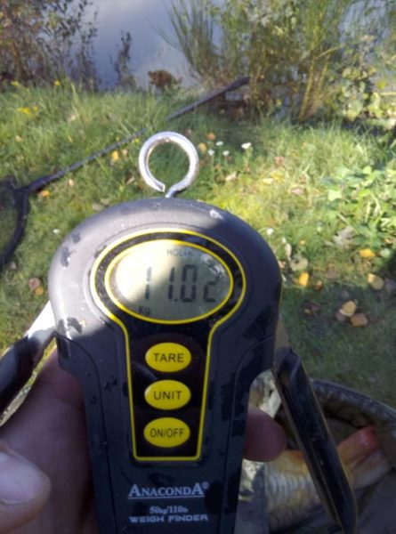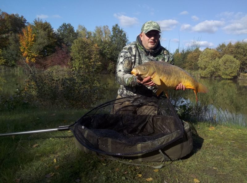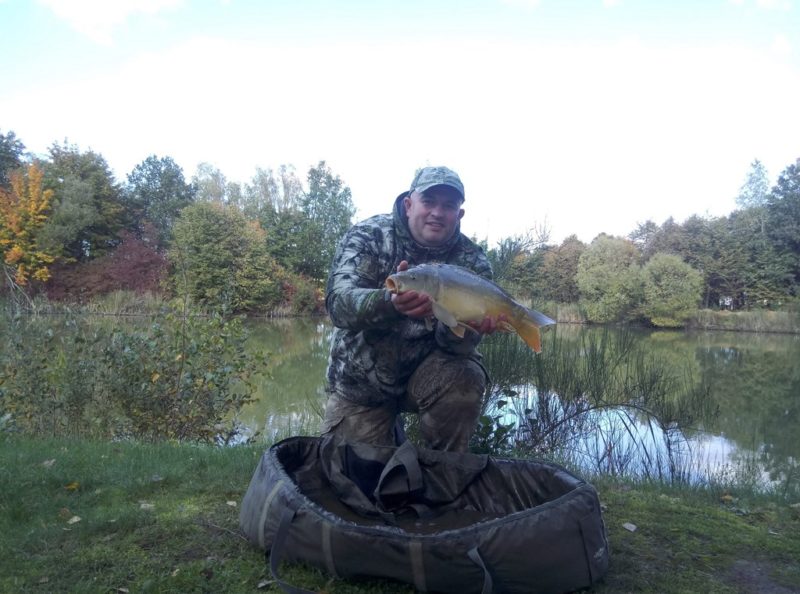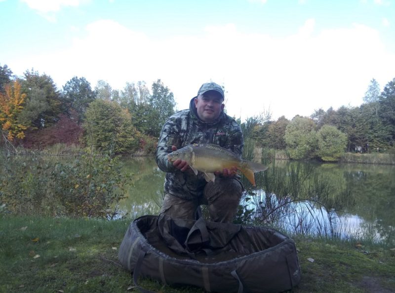 Pojawiłem się na łowisku około godziny 11 i po krótkich ustaleniach z wędkującymi wcześniej chłopakami mogłem wywozić pod swoje ulubione drzewo. Obserwując jednak wskazania termometru echosondy miałem nikłe nadzieje na dobre brania ryb. Na wstępie założyłem małe szesnasto milimetrowej średnicy kulki delikatnie podsypawszy każdy z zestawów garsteczką pelletu wywiozłem jeden na wodę głęboką a drugi na płytką. Jakież było moje zdziwienie, gdy po niecałej godzinie miałem pierwsze branie z zimnej wody nie dużego może trzy kilkogramowego karpika. W nadziei na taki wymiar ryb wpadłem na pomysł założenia nieco zmodyfikowanego przyponu do methodfeedera z małym hakiem 10 i pelletem na gumeczce. W między czasie wyszło słoneczko i wzrosła o kilka stopni temperatura wody na płytkim kawałku akwenu dodatkowo wiatr spychający ciepłą wodę zapewne też przyczynił się do stopniowego wzrastania temperatury. Sugerując się właśnie temperaturą postanowiłem obydwa zestawy położyć na płytkiej wodzie. Wywiozłem wędkę z pelletem i nie zdążyłem odpłynąć na 20 metrów modelem, gdy wolny bieg kołowrotka dał znać o braniu ryby. Musiałem skupić się na holu gdyż plecionka 15lbs i hak 10 nie sprzyja siłowym holom. Wędkę wzorem metod feederowcow trzymałem równolegle do lustra wody i spokojne na małym hamulcu zacząłem holować rybę. Początkowo dawałem jej zmoże trzy kilo. Jednak po paru minutach holu masa tej ryby w moich oczach zaczęła rosnąć. Nie mogłem się śpieszyć za bardzo i używać siły raz w trosce o pysk ryby a dwa że za plecami miałem małe audytorium złożone młodych wędkarzy, którzy ostro dopingowali. Hol niebezpiecznie wydłużał się a ja mogłem polegać tylko na hamulcu, bo plecionki, na które łowię nie mają rozciągliwości i błędów, o czym mogłem się boleśnie wiele razy przekonać nie wybaczają. W końcu w pełnej krasie ukazał się mój zacny przeciwnik był wspaniały i naprawdę zależało mi na tym by położyć go na macie. Nie spiesznie przeszedłem do końcowej fazy holu i w końcu po kilku moich prośbach moje cudo łagodnie dało się wprowadzić do podbieraka. Miny asystujących kolegów, którzy zobaczyli hak niknący w wardze ryby bezcenne. Dodatkowo muszę przyznać, że po zważeniu ryby kąt rozwarcia ich szczęk wzrósł, co nieco. A będąc szczerym z zadziwieniem oglądałem po raz kolejny pysk ryby po działaniu tych haków nie zauważyłem rozcięć przemieszczeń perforacji i innych negatywnych rzeczy hak z mikro zadziorem siedział pewnie w pysku. By przybliżyć wam założenia holu to wyholowałem blisko 11 kilogramową rybę, na haku feederowym nr 10, plecionce przyponowej 15lbs, plecionce jako lince głównej, na 3lbs karpiówkach a na domiar złego ciężarek o masie 100g nie zszedł z klipa. Nie pytajcie jak to zrobiłem, bo wszystkie zmienne wskazywałyby raczej na nie powodzenie. W końcu po ważeniu opatrzeniu pyska mogłem zrobić upragnione zdjęcie ryby, której złowienia od trzech lat zazdrościłem prezesowi mojego koła. Ryba była tak cudownie wybarwiona dodatkowo wielkie malownicze łuski okraszały tego osobnika karpiowej populacji niczym diamenty szyje jakiejś dorodnej dziewoi. Brakuje mi słów by wyrazić masę emocji, które w tym momencie przepływały przez moją głowę. Uważam, że był to wyczyn sezonu 2019 raz z racji upragnionej ryby dwa z racji udanego holu.