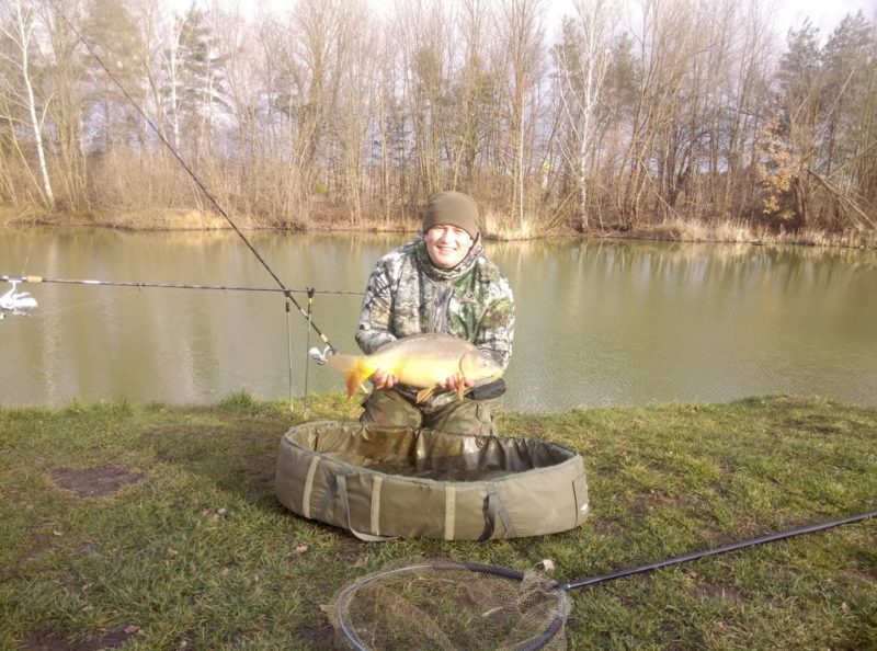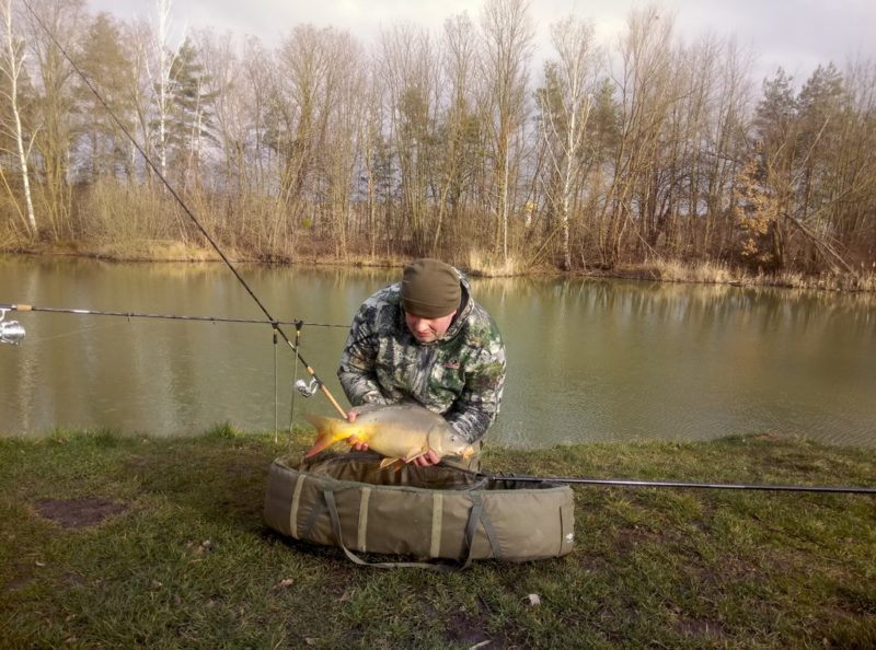 Przygotowanie pelletów i zanęty poprzedniego dnia wieczorem okazało się sprytnym posunięciem i nie narażony na kaprysy pogody mogłem podać co nieco przy pomocy mojego ciężkiego feedera i mini spomba w łowisko. Obawiałem się przekarmienia miejscówki a jednocześnie chciałem przyciągnąć i utrzymać w łowisku karpie. Całość operacji w celu zachowania maksymalnej precyzji odbyła się na klipowanym zestawie. Przeniosłem odległości na tyczki pomiarowe a następnie na zestawy do metody. Wywołałem tymi operacjami co nie co zdziwienia . W śród znajomków nieśmiało pokazujących się na łowisku. Jednak ja chciałem potrenować sobie bardziej niż zazwyczaj precyzyjne łowienie. Oczywiście nie zabierałem ze sobą feederarm’a i kosza ze względu właśnie na połączenie wędkowania ze zbieraniem składek. Nie przeszkadzało to jednak pierwszej rybie pobrać przynętę tuż po opadnięciu zestawu. Po szalonej walce za którą tak cenię mieszkańców moich glinianek. Na zdjęciu dzięki uprzejmości kolegi Marcina możecie zobaczyć w całej krasie karpika całkiem słusznych jak na małe haki i delikatny sprzęt rozmiarów. Oczekujący koledzy w przepisowej kolejce do opłat nie pozwolili mi przez dłuższą chwilę popracować nad braniami. Jednak po niecałej godzinie miałem ponownie oba zestawy w wodzie. Wymiana szczytówek w feederach z ultra light na medium hard zmieniła na tyle pracę moich wędzisk że ponownie musiałem opanowywać sztukę celnego nimi rzucania. Prawdopodobnie mogłem tymi nie udolnymi zabiegami rozproszyć co nieco rybę. Jednak dołowione jeszcze dwa karpie w krótkim czasie poprawiły mi humor na tyle że bez żalu. Zmarznięty ale i wyłowiony i uśmiechnięty wracałem odprężony do domu. Gdzie na tatę czekała wynudzona przymusowym pobytem w domu familia.