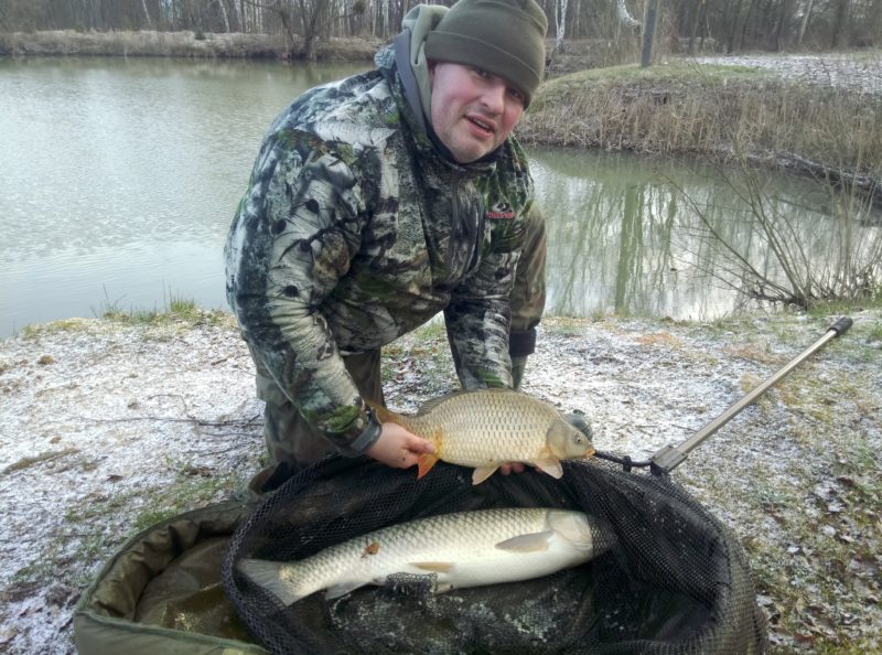 W kilka minut później jechałem przez opuszczone ulice pobliskich miejscowości. Pojawiłem się na łowisku gdzie koledzy spędzający nockę oddawali się porannemu przerzucaniu zestawów. Wywiedziawszy się gdzie łowią zająłem stanowisko. Drżąc z zimna wywoziłem po dwa zestawy na raz by maksymalnie skrócić czas przebywania na mrozie który do tego czasu wahał się w okolicy od dwóch do trzech stopni na minusie w zależności jak zawiał wiatr. Mało w tym momencie przejmując się ekologią pozostawiłem ogrzewanie w aucie włączone. I schroniłem się w przytulnym i ciepłym wnętrzu. Zgodnie z zaleceniami epidecznymi komunikowałem się ze znajomymi przy użyciu komunikatorów. Nie było mi jednak dane zbyt długo cieszyć się ciepłem bo sygnalizator postanowił zakłócić ciszę.  Holowałem sobie spokojnie małego łuskacza i w momencie gdy wprowadzałem jegomościa do podbieraka. Dał o sobie znać drugi sygnalizator. Po szalonej walce jako drugą rybę do podbieraka wprowadzałem amura. Szczęśliwy z pierwszego Azjaty oraz pierwszego dubleciku w sezonie poprosiłem kolegę Kazimierza o wykonanie zdjęcia. Ponownie narażony na zimno wywiozłem i gdy już przemarznięty miałem wracać do samochodu. Ponownie sygnalizator dał głos. Krótka szalona walka przy której oczywiście karp musiał ściągnąć drugi zestaw. Zakończyła się wyhaczeniem małego lampasika,  który jednak zbiegł z podbieraka w czasie gdy ja rozstawiałem statyw pod aparat. Trudno pomyślałem nastawiłem wodę na kawusie  przewiozłem zestawy i oddałem się rozmyślaniom. W między czasie głównie za sprawą postu kolegi Kazimierza uświadomiłem sobie że na bardzo ruchliwej zwykle drodze nie ma absolutnie żadnego ruchu. Wypiłem spokojnie rozgrzewający napój, poprzeglądałem socjal media. I ponownie sygnalizator przerwał sielankę. Niestety po krótkiej walce karp zszedł z zestawu. Ponowna wywózka i powoli zaczynałem obsługiwać już sprzęt by go spakować wykorzystując chwilowy brak wiatru. W momencie gdy matę już odwiesiłem do ocieknięcia mały pik zdradził kolejne branie. Tym razem z racji małego haka i cienkich materiałów przyponowych. Musiałem delikatnie holować rybkę i po kilku minutkach moja radość nie miała granic. Nagle zrobiło się ciepło, wiatr przestał przeszkadzać, mokre ręce piec z zimna, bo w podbieraku był on. Jeden z najładniejszych karpi mojego łowiska, niedościgniony ideał i krasa. Oczywiście mój telefon musiał się w czasie robienia zdjęć wyłączyć. Bez skrupułów zakłóciłem jednak śniadanie Kazimierzowi bo właśnie ta ryba byłą warta tej fatygi. Musiałem mieć pewność że zabiorę ja ze sobą na zdjęciach. Podziękowałem za sesję Kazimierzowi spakowałem sprzęt. I szczęśliwy jak nigdy wracałem do domu. To był drugi raz gdy ta krasa postanowiła pozować mi do zdjęć. Ciesząc się że jest w dobrej kondycji nie mogłem przestać o nim myśleć. Miało to taki skutek że czekałem dwie zmiany świateł na lewoskręt na pustej drodze. W domu wszyscy wyczuli moją radość, pochwaliwszy się zdjęciem wszystkim domownikom. Przygotowałem herbatę a na stole zagościł wyczarowany przez małżonkę sernik. Wszak okazja była zacna.