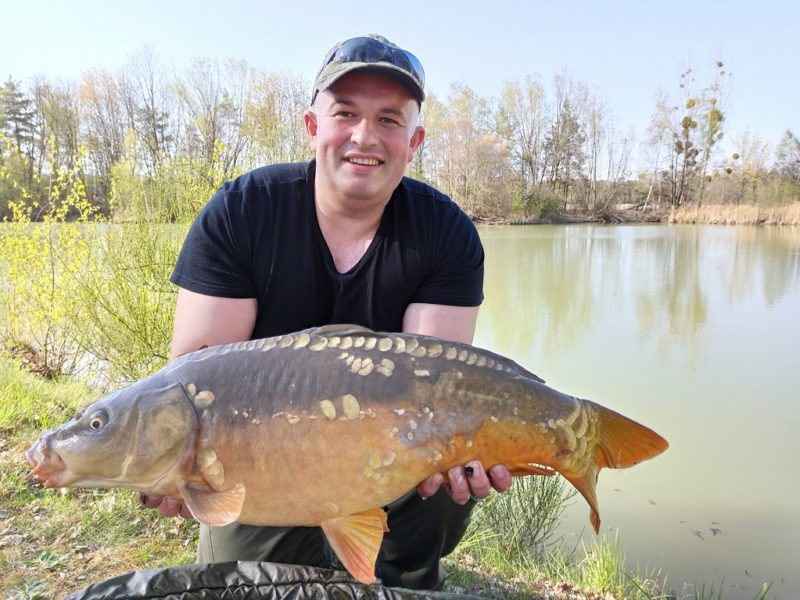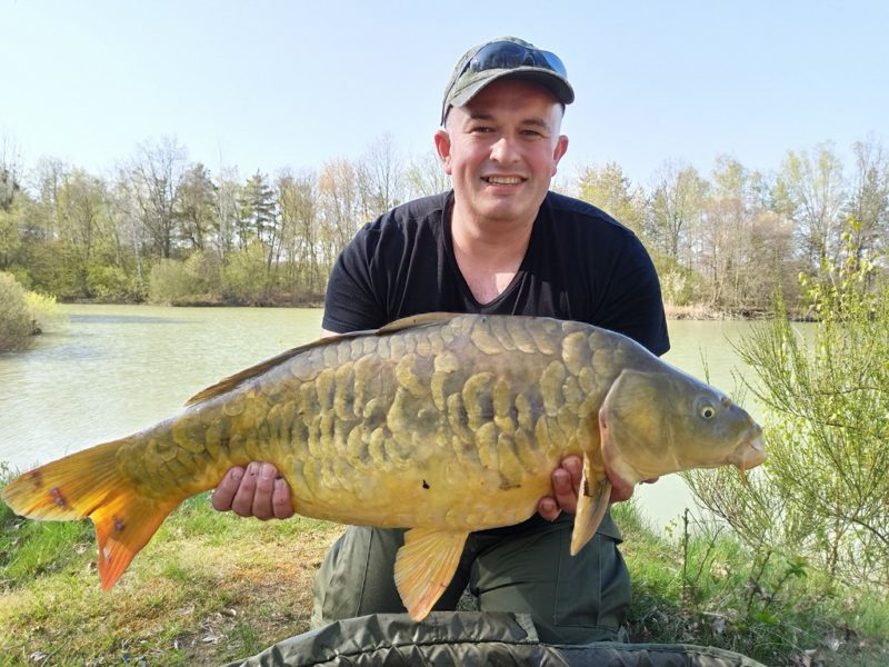 We wtorek dwudziestego pierwszego kwietnia przezornie poprosiłem kolegę Dariusza o zajęcie jakiejś ciekawej miejscówki i zwolniwszy się chwilkę z pracy jechałem na łowisko by w końcu wypróbować w jakikolwiek sposób nowe kijaszki. Kilka próbnych rzutów pozwoliło potwierdzić moje przypuszczenia co do nowych wędzisk, wywiozłem na  raz dwa zestawy i przekazałem model RC Dariuszowi który nie śpiesznie przygotowywał swoje również czekające na testy wędki. Rozsiadłem się wygodnie i spokojnie delektując się piwkiem oczekiwałem na ten najprzyjemniejszy moment w czasie wyprawy. I prawdę powiedziawszy zbyt długo czekać nie musiałem. Dźwięk sygnalizatorów wyrwał mnie z rozmyślań i w końcu mogłem sprawdzić podczas holu nowe wędzisko. Bardzo zadowolony z pracy kija bardziej skupiałem się na pracy kija ucząc się jego zachowania niż na rybie w wodzie. Po chwili jednak gdy po raz pierwszy ukazała się ona przy powierzchni. Moje priorytety uległy zmianie. Była to kolejny raz moja złota ślicznotka najładniejsza ryba na łowisku. Nadmiar szczęścia spowodował niesamowitą błogość a uśmiech okrasił moją twarz. Wiosna i cały rozkwitnięty świat wydał się jeszcze cudowniejszy. W końcu na macie pojawiła się moja ryba. Szybka sesja zdjęciowa i opatrzenie ranek na płetwie i ryba majestatycznie odpłynęła by sprawić przyjemność komuś innemu.