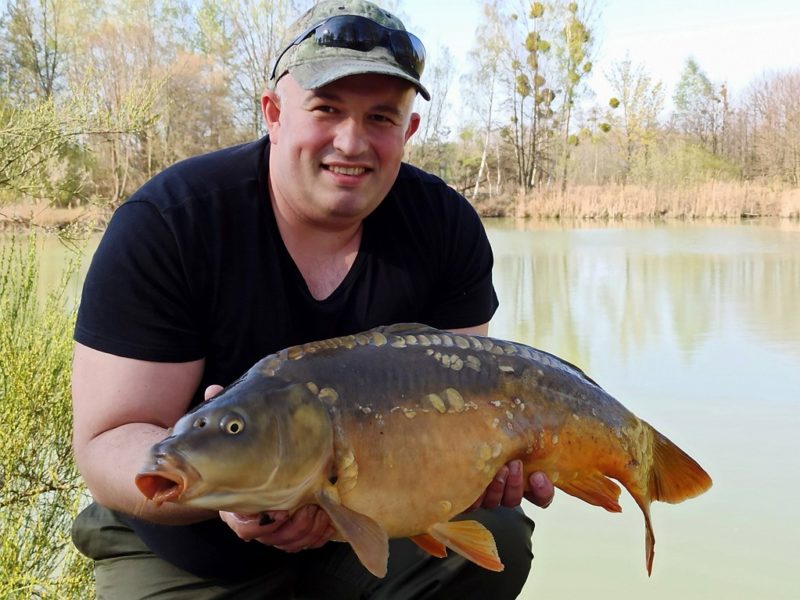 By ochłonąć co nieco usiadłem na chwilę wystawiając się na kojące działanie słońca. Po chwili ponownie przewiozłem zestawy i nie dane było mi zbyt długo cieszyć się spokojem. Gwałtowne branie przy zaczepie i odjazd zrzucił z podpórek moja wędke i tylko dzięki szybkiej reakcji Dariusza nie musiałem skakać za nią do cokolwiek chłodnej jeszcze wody. Po dynamicznej walce na macie zagościł nieco mniej okazały ale również śliczny karpik który chętnie zapozował do zdjęć. Po tym braniu do samego wieczora miałem już spokój więc ponownie w skupieniu i niezwykłej jak na lokalizację łowiska ciszy ponownie przeżywałem cudowne chwile holu ryb. Gdy słońce schowało się za horyzontem nastał chłód i czas powrotu do rodziny. Wracałem uśmiechnięty i szczęśliwy. Dzień mimo że krótki i zakończony dwoma rybami na macie, był niezwykle owocny.