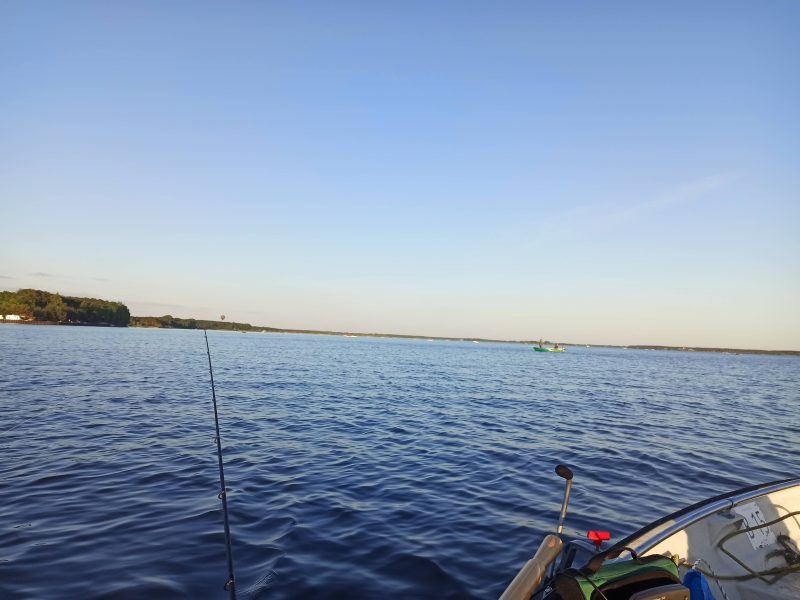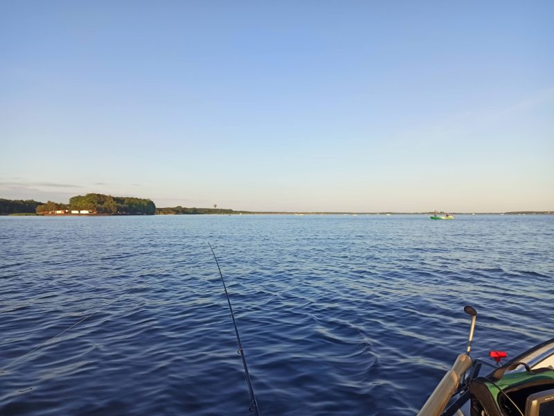 Rzeczywistość zastana o świcie nad zbiornikiem otrzeźwiła nasze zapędy bo liczba łódek oscylująca w okolicy 400 i popisy kolegów wyposażonych w silniki o wysokiej mocy oraz brak świateł nawigacyjnych w mojej łodzi stwarzał zbyt niebezpieczne sytuacje na wyruszenie w warunkach słabej widoczności. Wypiliśmy więc wzorem bardziej doświadczonych kolegów na spokojnie po zacnej kawie zjedliśmy śniadanie i bez większej spiny około godziny 5:30 udaliśmy się na podpowiedziane miejscówki. Rady znajomych i odczyty z echosondy ułatwiły mocno namierzenie żerowisk sandacza i nawet mi osobie mocno początkującej w tej materii, udało się całkiem ładnie połowić. Przy okazji łowienia miałem okazję po dyskusji z Jackiem i wypróbowaniu jego wędzisk do zaplanowania i natychmiastowego wdrożenia kolejnych modyfikacji sprzętowych. Moje ciężkie zestawy sandaczowe zakupione z myślą o Odrze słabo nadawały się na dłubanie delikatnymi przynętami na metrowej wodzie. Przełowiłem więc cały dzień w większości przypadków stosując moją ciężką wklejankę okoniową łowiąc kilka całkiem przyjemnych rybek.