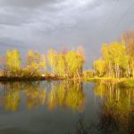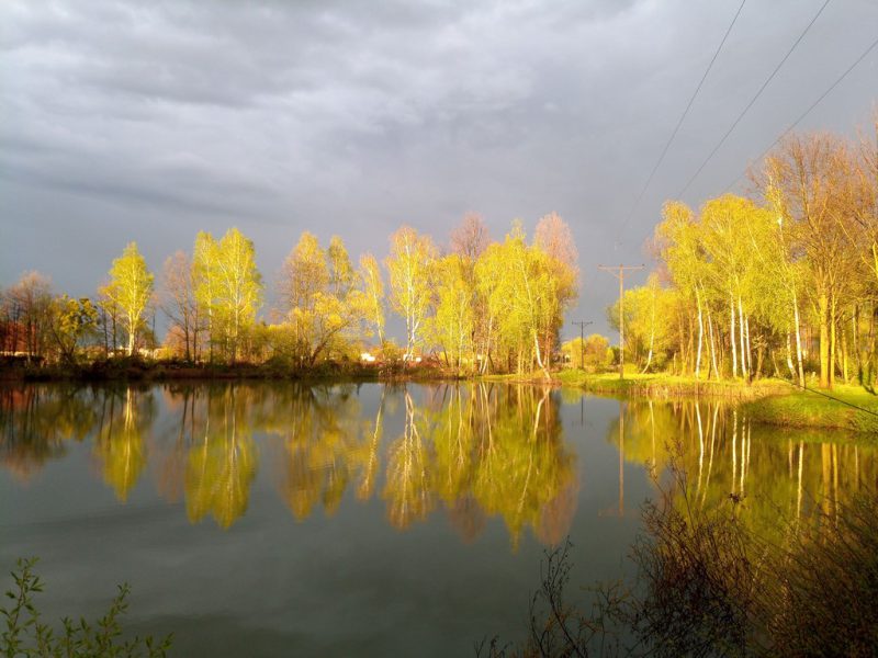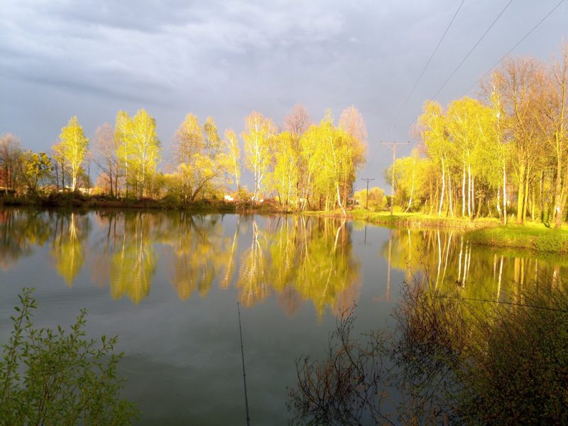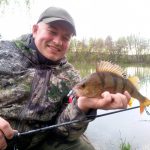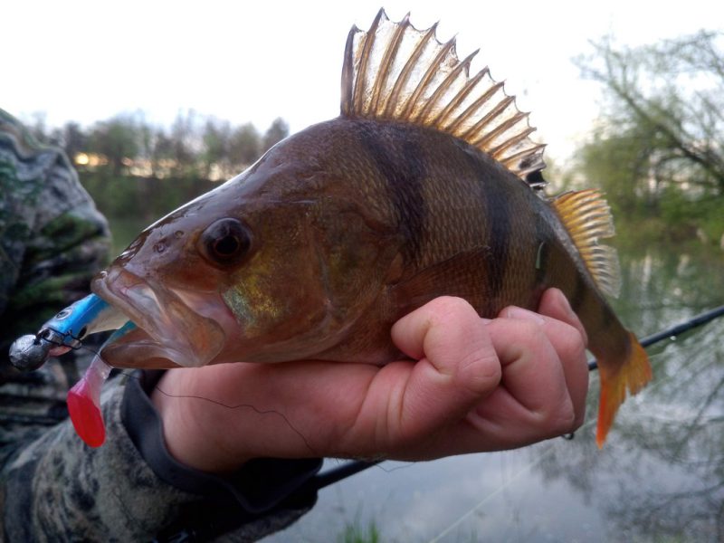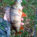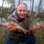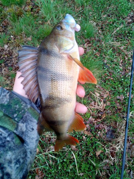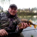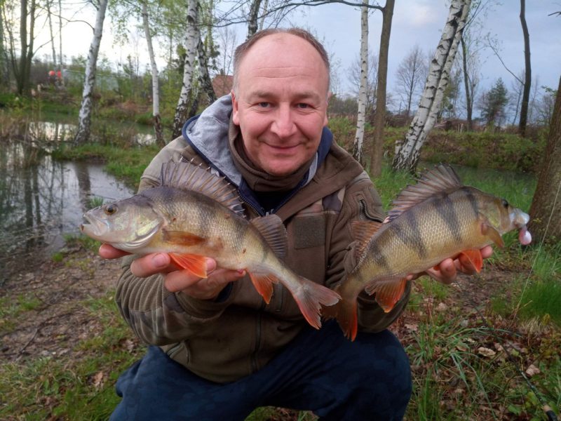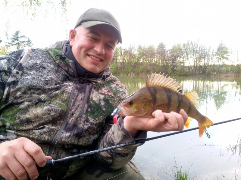 Wyniki testów pozwolę sobie pozostawić jako temat na inny artykuł gdyż nie wiem kiedy przynęty zostaną wprowadzone do obrotu.  Miło było spotkać się z przyjacielem i rozprawiając o sytuacji i rzeczach w które wybiły niczym szambo w naszym związku łowić pasiaki. Pierwsze chwile nad wodą przyniosły nieco drobnicy i miałem sposobność cieszyć się moim ultralightem. Byłem niezwykle zadowolony z pracy wędziska w zestawie z nowym kołowrotkiem i plecionką szukałem sposobu na grubszego psiaka. Pasiaka który rzekomo miał się w końcu ruszyć. Chwila szybszego bicia serca nastąpiła gdy na drobną gumeczkę połakomił się krótki szczupaczek. Dobre tempo zacięcia i fartowne ułożenie przynęty w pysku ryby pozwoliły wyciągnąć go i uwolnić od niepotrzebnej biżuterii.  W końcu gdy słoneczne niebo pokryły burzowe chmury powodując wspaniałą grę światła na młodej zieleni liści brzóz, woda otworzyła się i stadko średniaków 30+ uaktywniło się biorąc raz za razem. Wspaniałe emocje i znakomita współpraca ryb trwał zaledwie krótką chwile. Skończyła się gdy biegiem już w kroplach deszczu uciekaliśmy do aut. Mimo wszystko udało się zrobić kilka fotek i spędzić dość produktywnie nad niezwykle chimeryczna jeżeli chodzi o okonie wodą. Przyznam się wam że okonie czasami nie współpracują tam całe tygodnie by wynagrodzić raz na jakiś czas cierpliwych lub tych którzy pojawią się w odpowiednim czasie o odpowiedniej porze nad wodą.