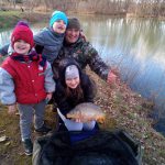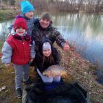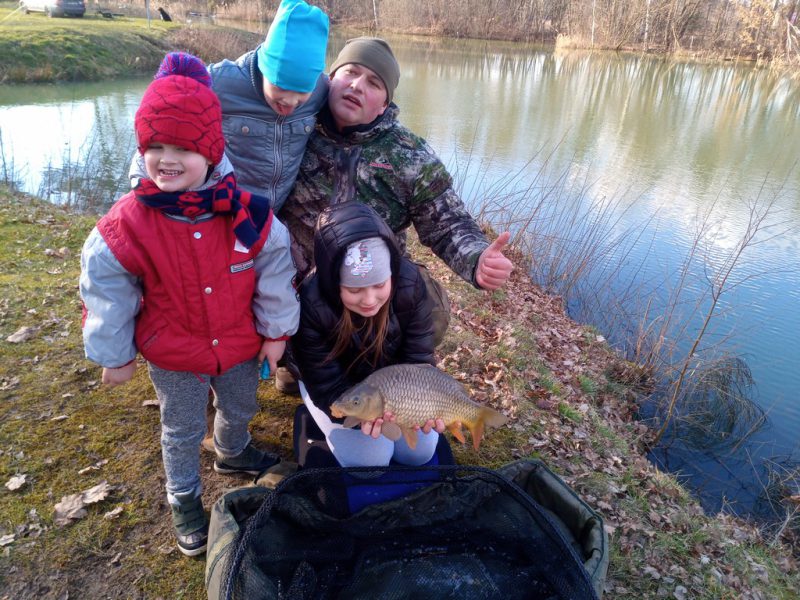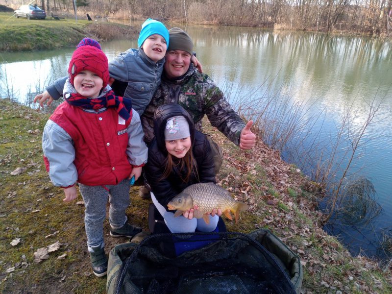Nie musieliśmy długo czekać na pierwsze brania niestety nie trafione. Magdalena niezrażona przerzucała zestawy poszukując aktywnych ryb. Na efekty jej działań nie trzeba było zbyt długo czekać. Szczytówka jej wędki przyjemnie się ugięła i Magdalenka w tępo uniosła wędkę ku górze, oparła dolnik o biodro i przytrzymała chwile rybę by odeszła od zawad. Z dumą patrzyłem na hol w wykonaniu najdroższej córki. Branie wywołało poruszenie wśród dzieci tak że zbiegły się by kibicować siostrze.  Małżonka uwieczniła wspaniałe momenty holu na zdjęciach a ja z racji stromego brzegu pozwoliłem sobie podebrać rybę. Gdy dzielnie walczący karp leżał bezpieczny na macie i emocje nieco opadły przyszedł czas na rodzinna sesję zdjęciową. Niesamowite ile radości potrafi rodzinie sprawić mały wypad na ryby. Niestety była to jedyna ryba tej wyprawy nie mniej cieszyła podwójnie. Spakowaliśmy się po jakiejś godzince  i wróciliśmy do domu by oddać się nowemu rodzinnemu zwyczajowi, czyli oglądaniu w sposób rodzinny filmów na jednej z platform stremingowych.
