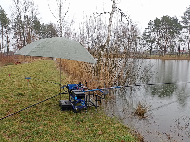 Po uregulowaniu formalności postanowiłem zawitać w końcu nad wodę, pogoda była mało sprzyjająca. Ciągłe opady deszczu ze śniegiem skutecznie zniechęciłyby każdego do wyprawy nad wodę ale nie mnie wygłodniałego po dwóch miesiącach wędkarskiego postu. Odpowiednie ubranie plus mój wierny parasol zapewniały odpowiedni komfort termiczny a termos z kawą zapobiegał szybkiemu wychłodzeniu organizmu.