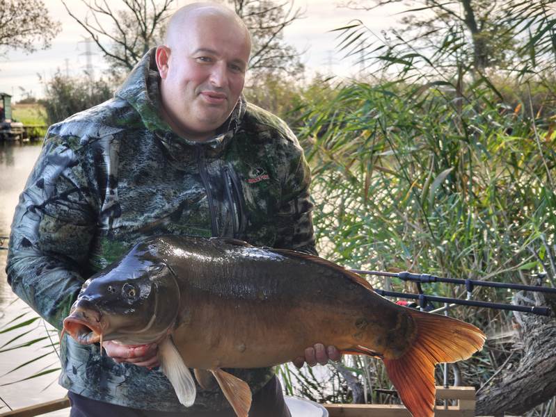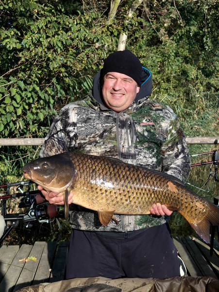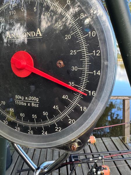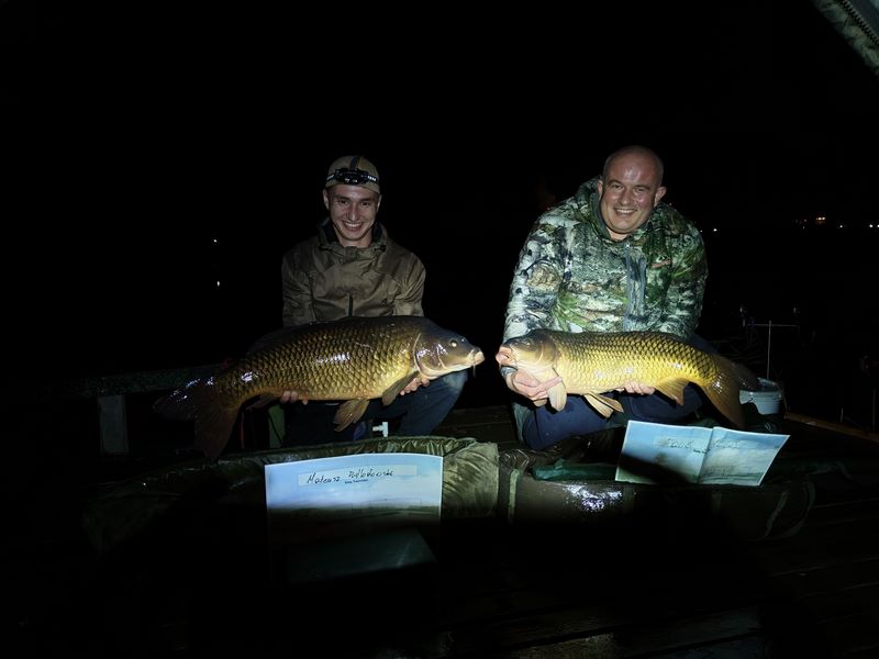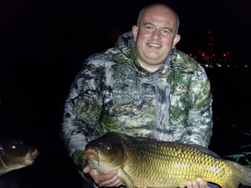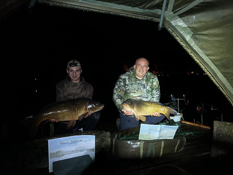 W między czasie zachodnią i południowo zachodnią część Polski dotknęła powódź i zawody stały pod znakiem zapytania. Jednak sytuacja wyjaśniła się na wałach przeciwpowodziowych bo układając worki z piaskiem, spotkaliśmy organizatora zawodów który również nie pozostawał obojętny na żywioł, niszczący dorobki ludzi i zabierający ich życia. Stwierdził on że sytuacja się stabilizuje a zawody przyjmą charakter imprezy charytatywnej i pomogą powodzianom. Nie wypadało nie wziąć udziału w takiej imprezie więc tym bardziej pilnowałem spraw służbowych by pozwoliły być na tym wydarzeniu. Nie przewidziałem jednak że na dzień 27 września w którym rozpoczynaliśmy zawody wypadnie w moim kalendarzu szczepień wypadło szczepienie przeciw tężcowi i durowi brzusznemu. Szczepionki te działają na mój organizm co nieco nie korzystnie i wprowadzają go w stan przed gorączkowy, zaczynają mnie boleć wszystkie stawy i mięśnie. Jak jechałem na rozpoczęcie zawodów byłem tak słaby że nawet nie myślałem już o rozbijaniu namiotu tylko stwierdziłem że wnętrze auta będzie mi schronieniem na najbliższe dwie noce. Wylosowaliśmy wraz z sąsiadem Mateuszem piękny i obszerny pomost na otwarciu stawu, mieliśmy mnóstwo ciekawych miejsc do obławiania. Ja wybrałem jednak najłatwiejsze technicznie z racji samopoczucia, czyli styk twardego dna z miękkim a Mateusz ambitnie z groundstickiem badał potencjalne miejscówki w różnych mniej lub bardziej dostępnych zakamarkach łowiska. Po wytypowaniu łowiska zanęciliśmy położyliśmy zestawy a Mateusz naszą i tak już osłoniętą miejscówkę ucywilizował jeszcze swoim dailyshelterem pod który wstawiliśmy fotele. W tym czasie w opadach deszczu i przy porywistym wietrze inni zmagali się z rozstawieniem obozowiska. Wykończony przeprosiłem Mateusza i postanowiłem zaszyć się w śpiworze i zasnąć. Złośliwe ryby nie pozwoliły na sen tuż po tym jak w śpiworze zrobiło się ciepło nastąpiło piękne branie i długi męczący hol ryba trafiła do worka i ponownie zestawy poszły w wodę. Nadmienię wam że łowiłem na kulkę poniewarz nie miałem siły schylić się po kukurydzę do beczki i nadziewać ja na włos, mało tego na kulkę losowo wybraną z pojemnika z kulkami. A że ostatnie kule jakie tam włożyłem były to wygrane na ostatnich zawodach kule o smaku squida z DKK to i na takie też łowiłem i jak czas pokazał znakomicie się sprawdziły. Miałem łącznie siedem wspaniałych brań w z czego na macie znalazło się cztery wspaniałe ryby w tym bigfish zawodów ryba o masie 16,4kg.