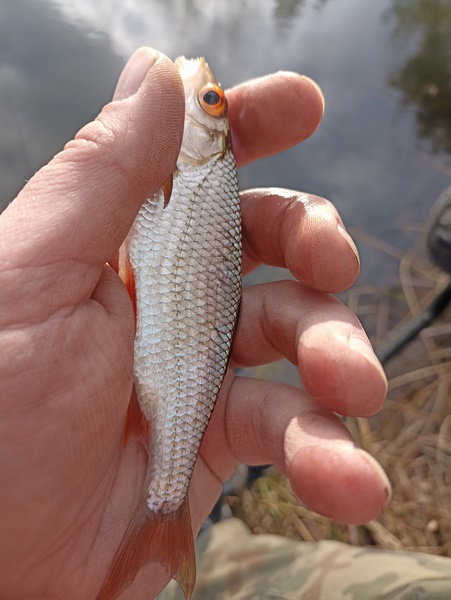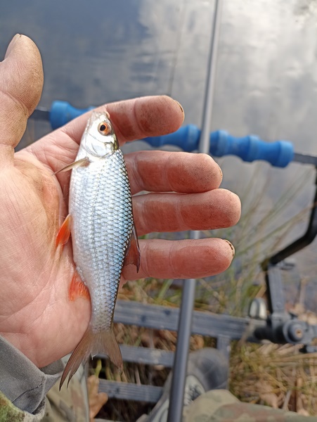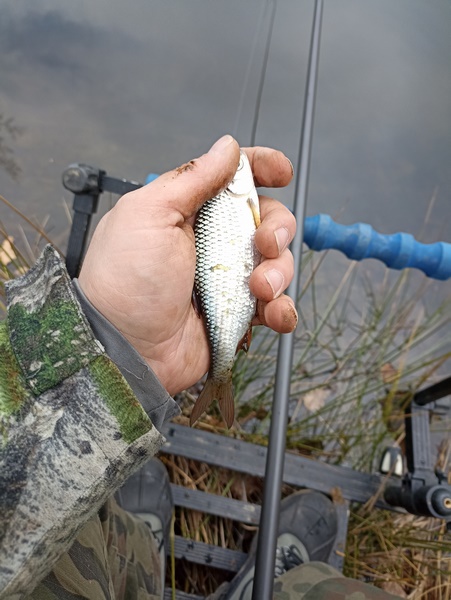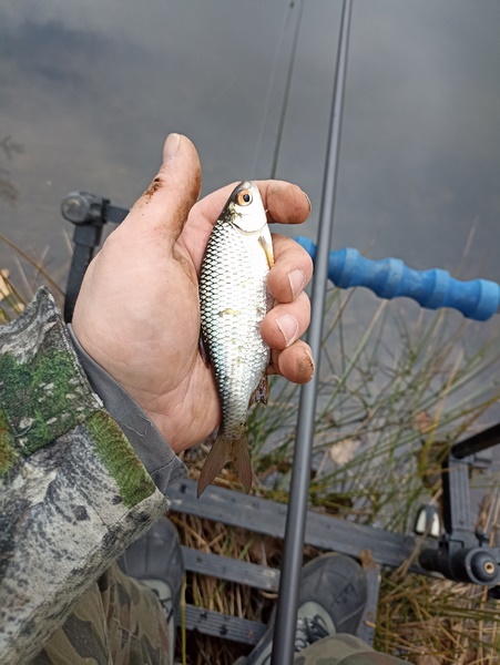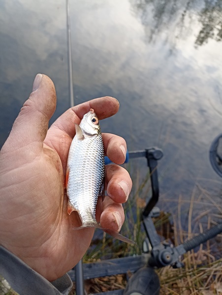 Na pierwsze brania musiałem chwilę poczekać, rozmawiałem z Piotrem i patrzyłem jak coraz intensywniej znika pokrywa lodowa. Pierwszą rybą sezonu 2025 była mała płoteczka. Wspomniałem od razu po jej uwolnieniu jakie okazy łowiło się tu zimą jeszcze kilka lat temu. Niestety pożar nielegalnego wysypiska do którego gaszenia użyto wody z tego stawu skutecznie o 1,5m obniżając jej poziom oraz nienasycona chęć mięsa i wielkie obłożenie wędkarskie spowodowało wytrzebienie tej wody.