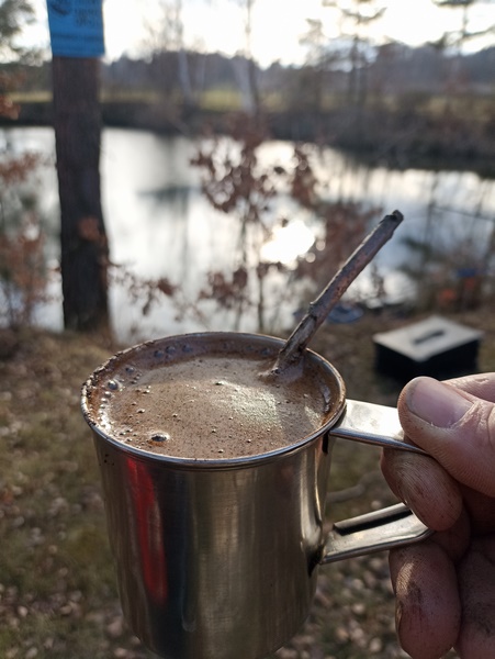 Nie zdziwił mnie duży ruch na łowisku osób pragnących kontaktu z rybami, zniechęcała ich mała dostępność wody i po rundzie wokół trzech glinianek odjeżdżali z łowiska. Na spacer również przyszedł kolega Piotr któremu zaproponowałem kawę by w czasie rozmowy gardła było czym nawilżać i mimochodem stał się autorem części zdjęć. Fajnie jest spotkać znajomych na łowisku i porozmawiać o wędkarstwie i planach na rozpoczęty sezon. Trochę mnie serce zabolało gdy uświadomiłem sobie że moim planem jest wierna służba Rzeczy Pospolitej jak to się mawia w mojej branży „życie”, noszenie munduru zobowiązuje….