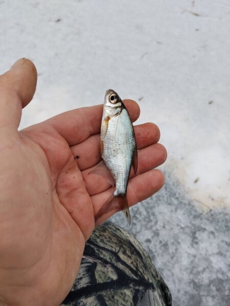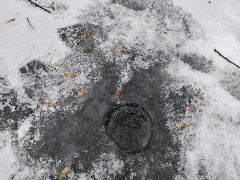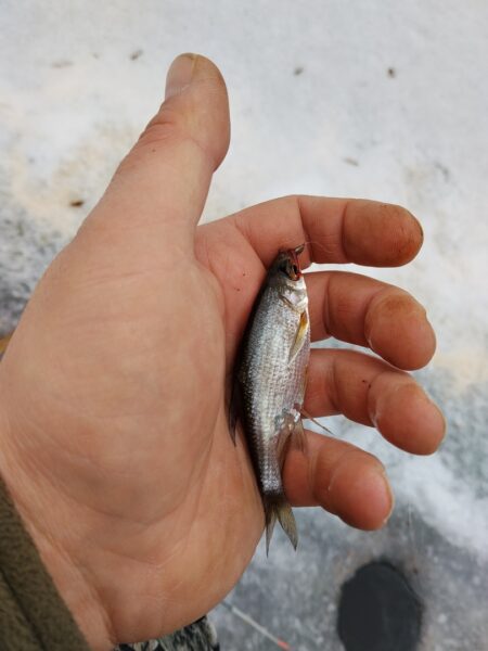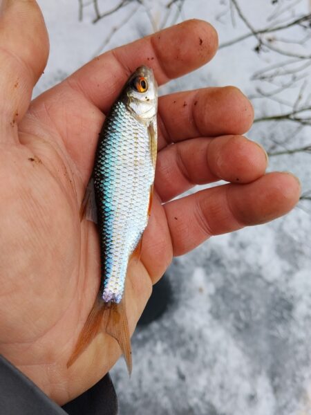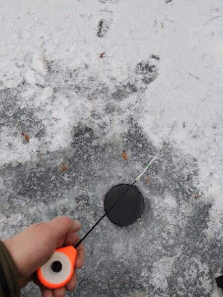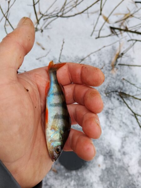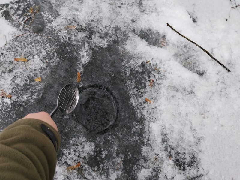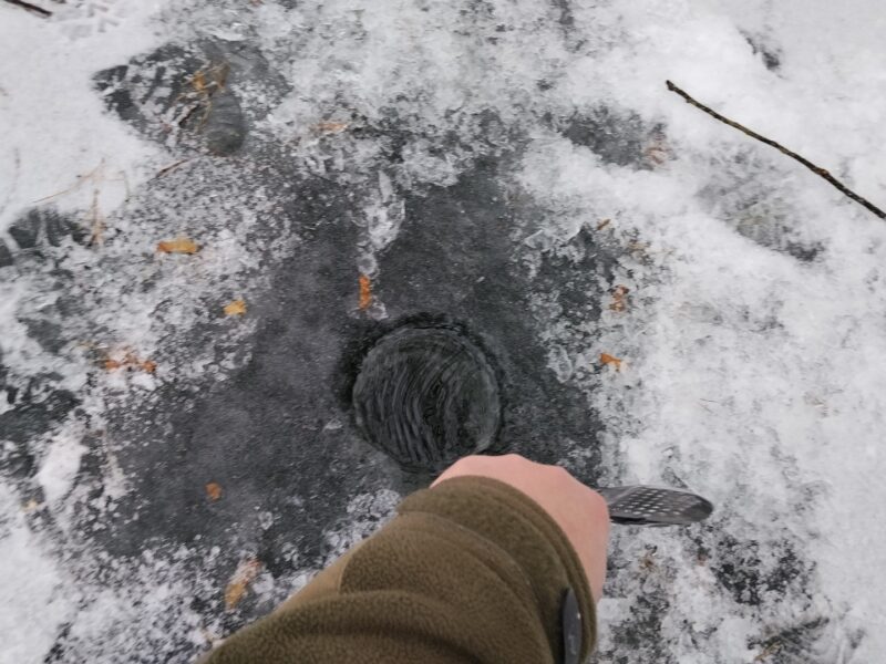 Dzielnie przez trzy godziny opatulony w ulubiony kombinezon w butach z trzema parami skarpet pielgrzymowałem od otworu do otworu walcząc z zamarzająca wodą, wiatrem i mało świeżą ochotką. Ochotką, którą było z racji jej kondycji bardzo ciężko nadziać na hak.